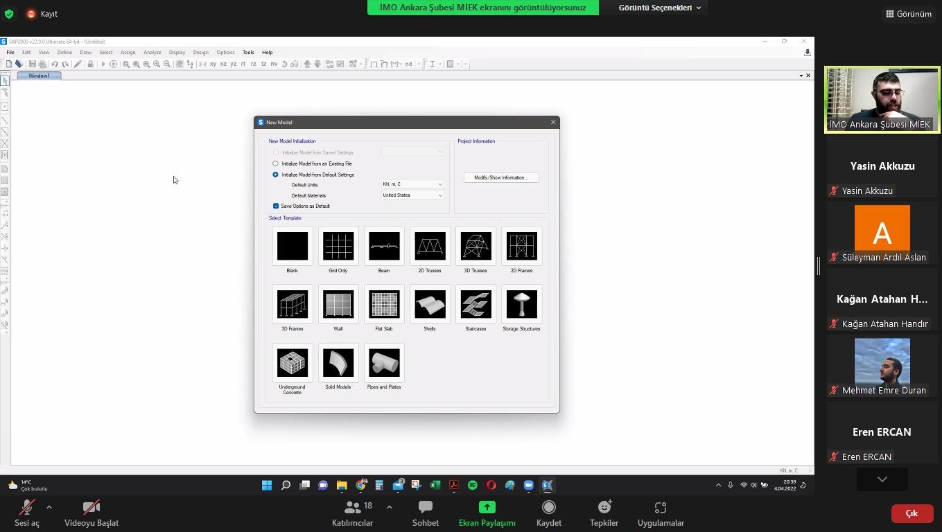 İMO Ankara Şubesi tarafından 04-16 Nisan 2022 tarihleri arasında hibrit eğitim modeliyle genç-İMO üyelerine özel SAP2000 Temel Seviye Eğitimi düzenlendi. 25 saat devam eden kursa 19 kişi katıldı.