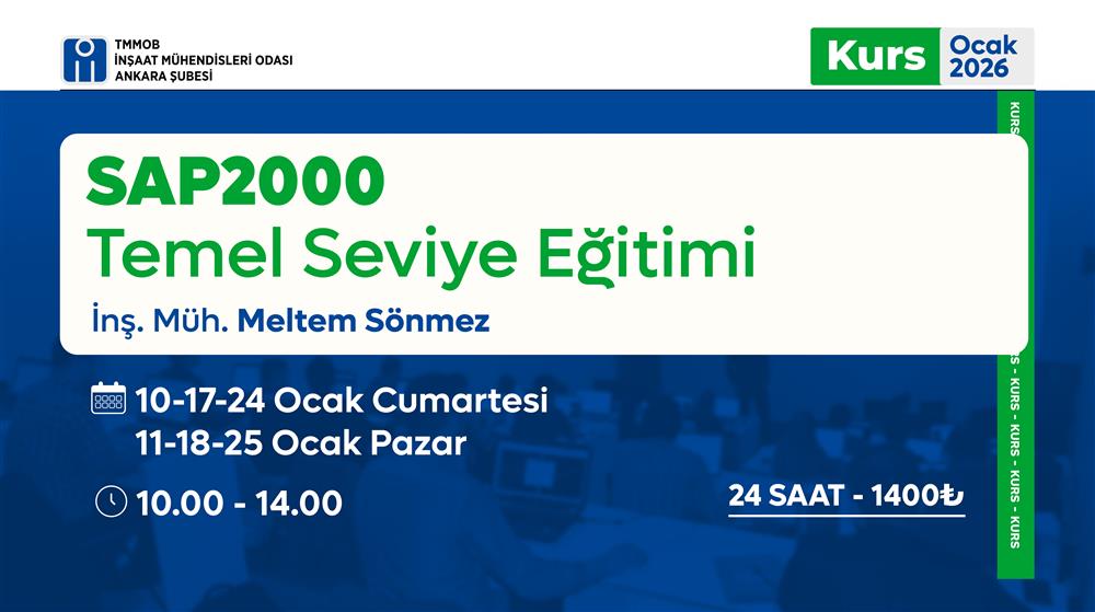 10-11-17-18-24-25 Ocak 2026 tarihlerinde Şubemiz tarafından SAP2000 Temel Seviye Eğitimi düzenlenecektir
