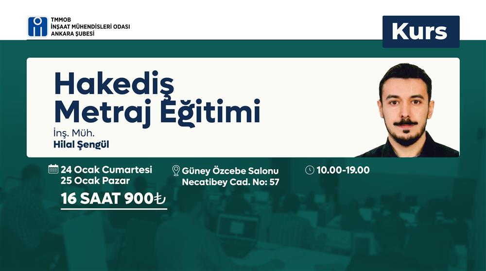 24-25 Ocak 2026 tarihlerinde Şube binamızda “Hakediş Metraj Eğitimi” düzenlenecektir