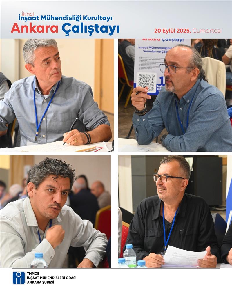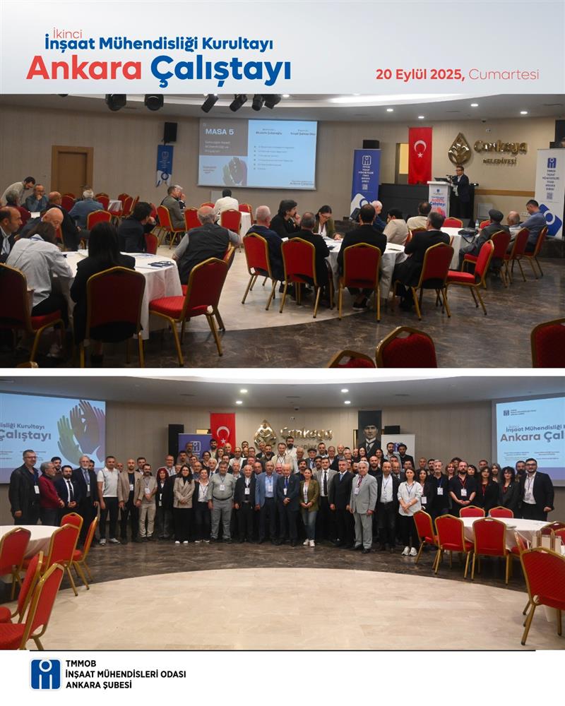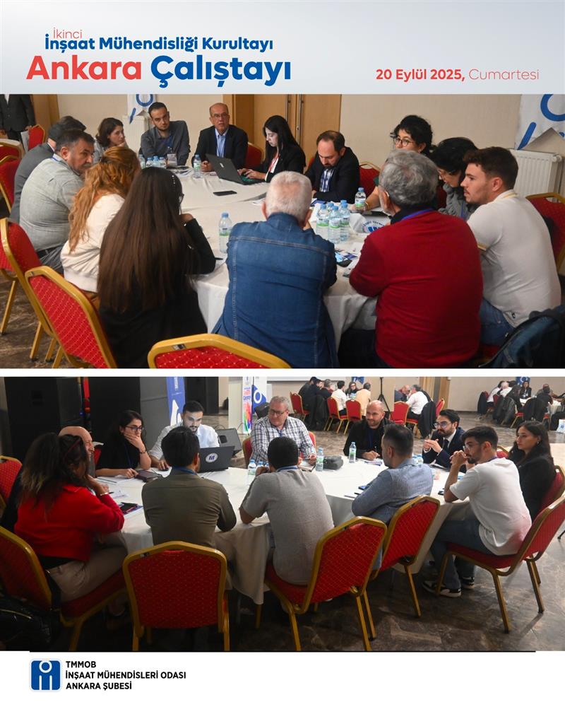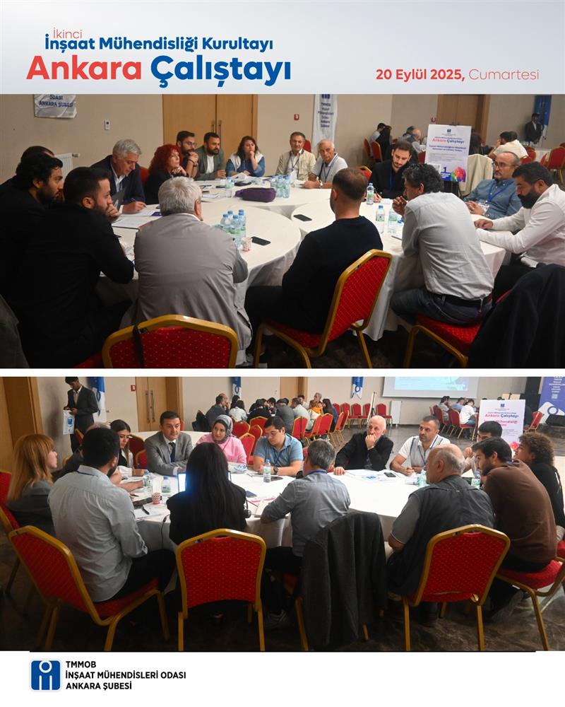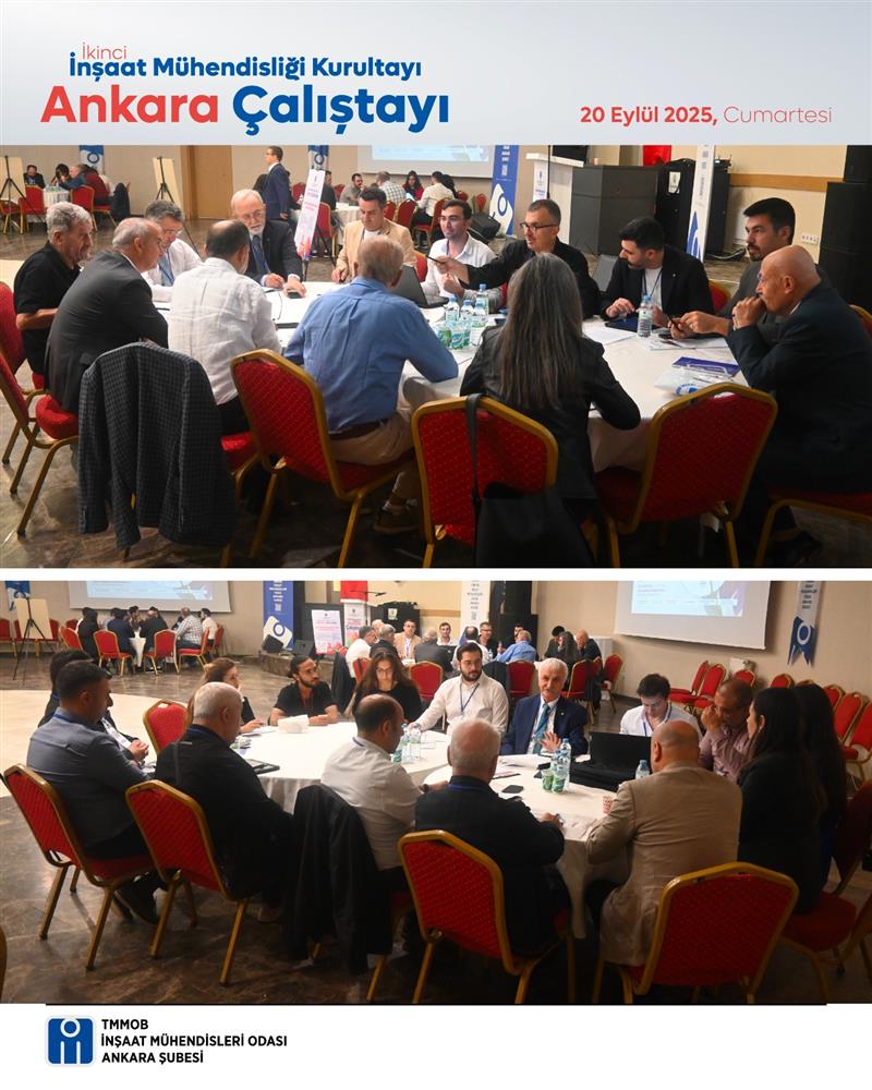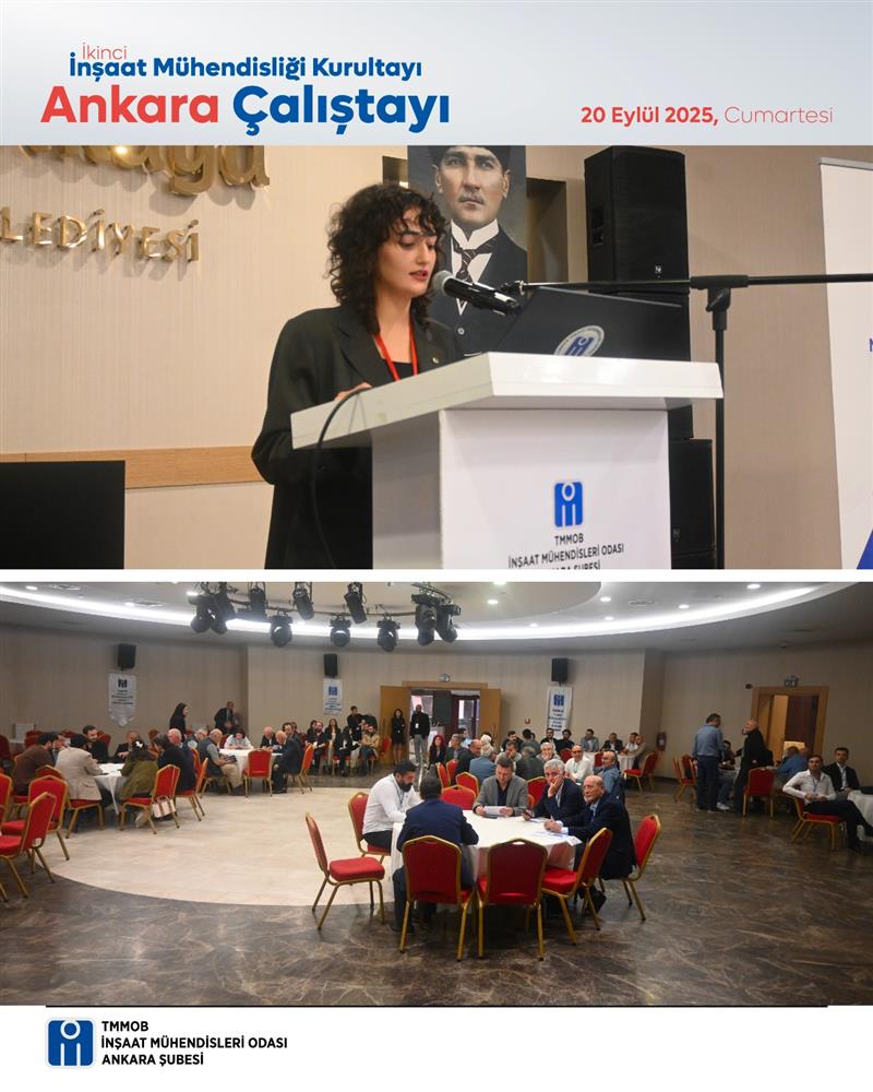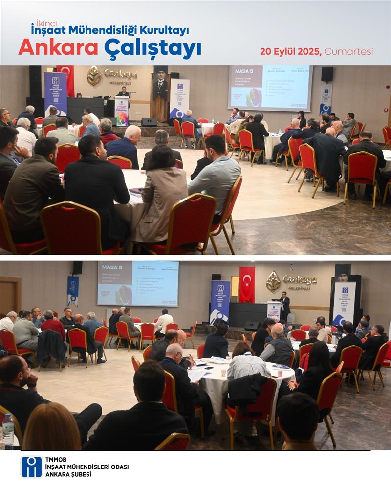 TMMOB İnşaat Mühendisleri Odası tarafından yılsonunda düzenlenecek olan İkinci İnşaat Mühendisliği Kurultayı’na hazırlık kapsamında üyelerimizin görüş ve önerilerini doğrudan kurultaya taşımak amacıyla Ankara Çalıştayı 20 Eylül 2025 Cumartesi günü Çankaya Belediyesi Vedat Dalokay Kokteyl Salonu’nda gerçekleştirildi. Çalıştayın açılış konuşması İMO Ankara Şubesi Yönetim Kurulu Başkanı Ahmet Onur Özergene gerçekleştirmiştir. (Özergene'nin konuşmasının tamamına haberin devamından ulaşabilirsiniz.) Daha sonra İMO Ankara Şubesi Şube Sekreteri Mahir Kaygusuz tarafından çalıştay içeriğine dair bilgilendirme sunumu yapılmış ve masa seçimleri gerçekleştirilmiştir.