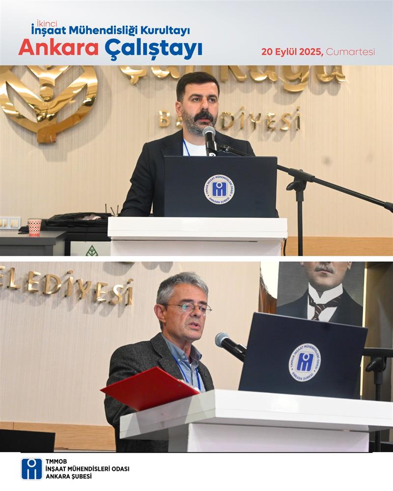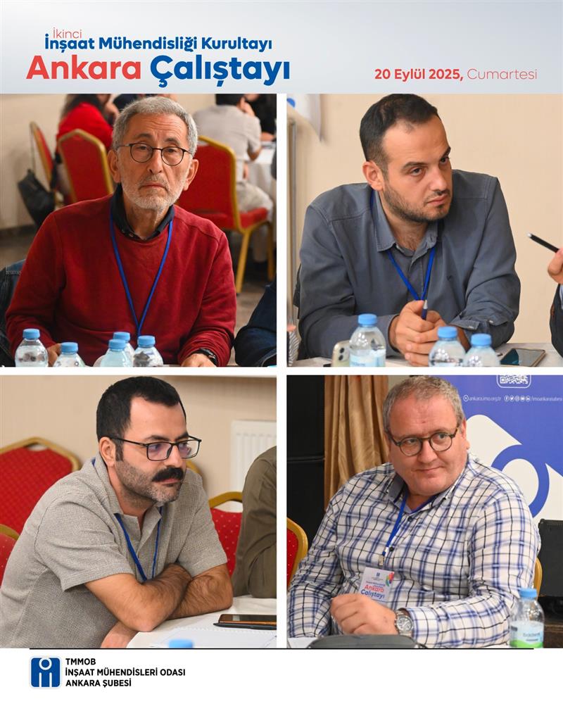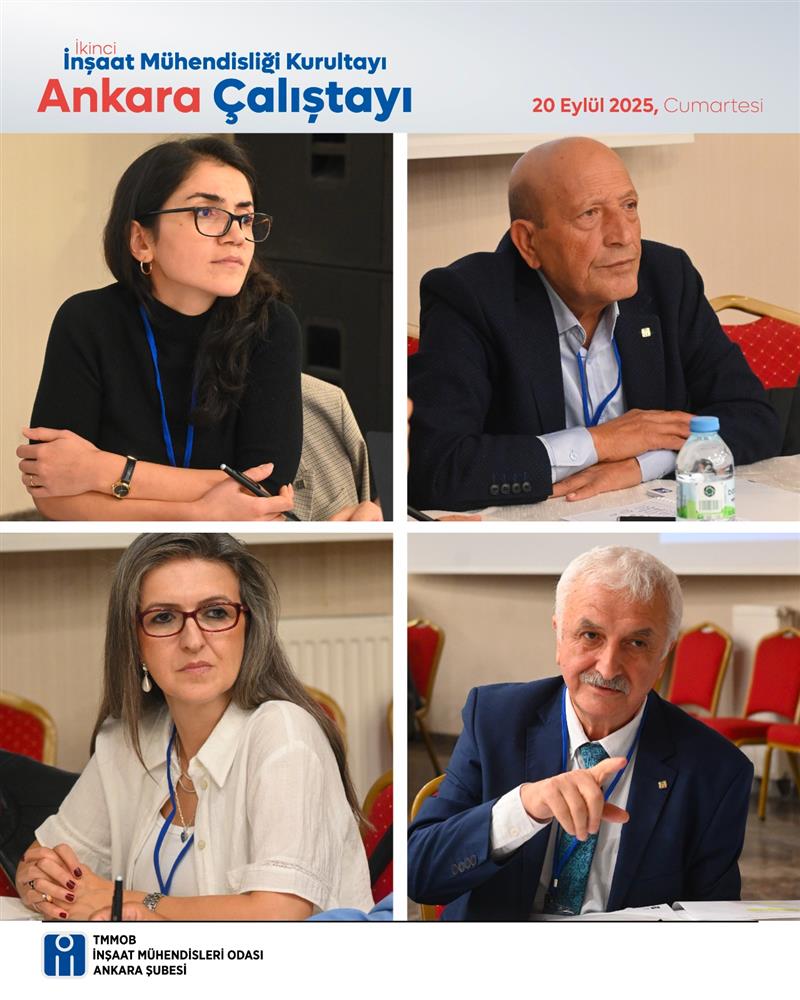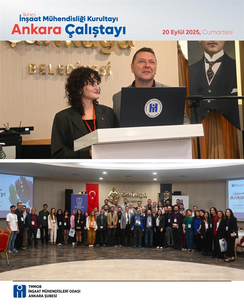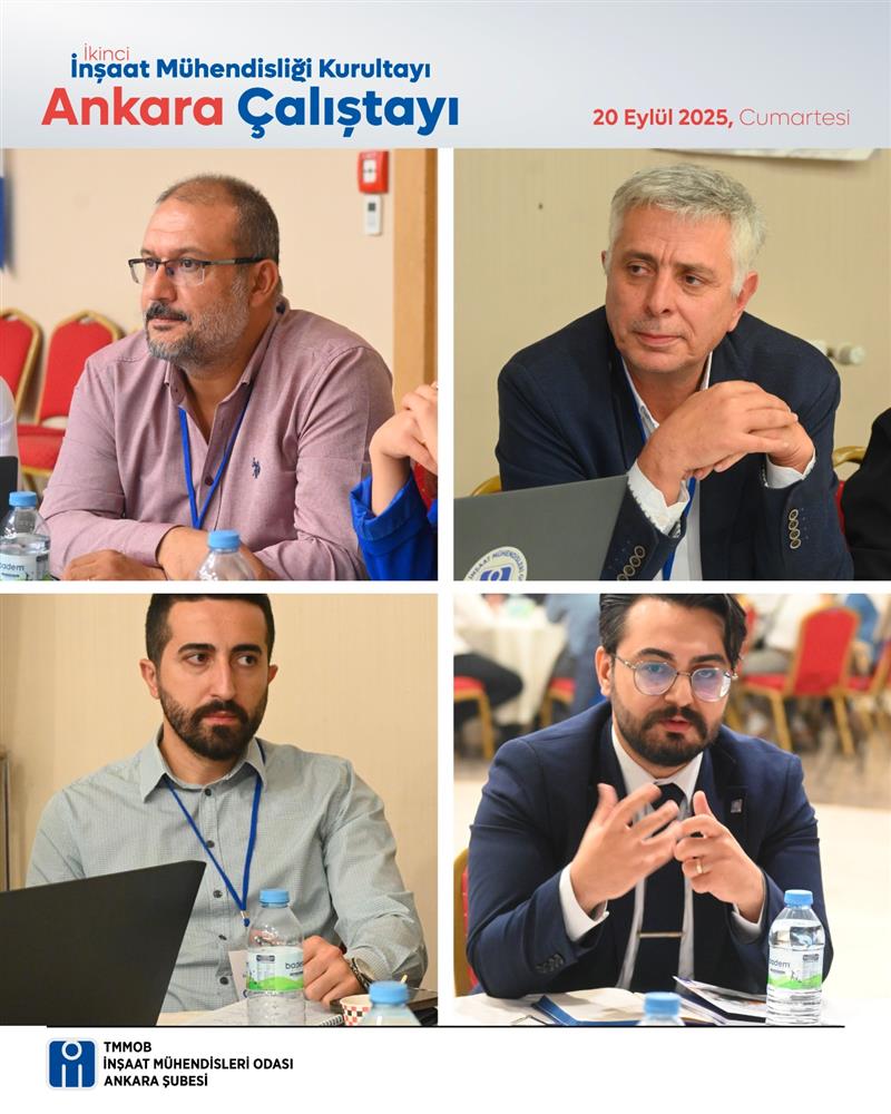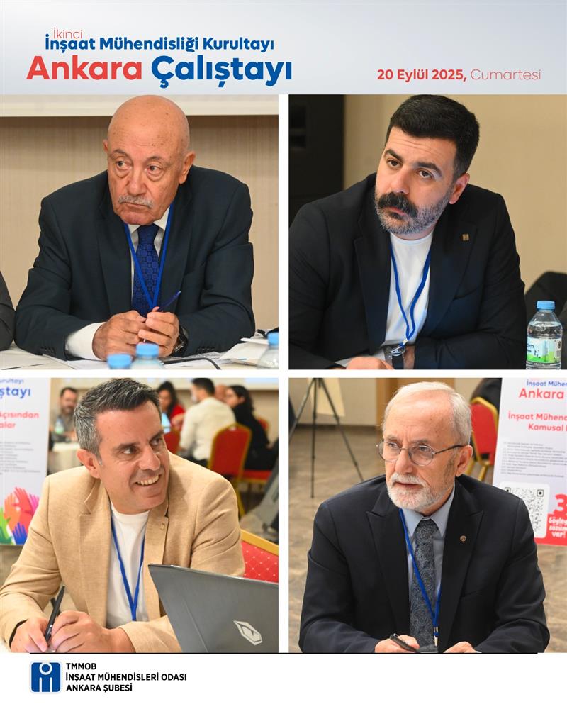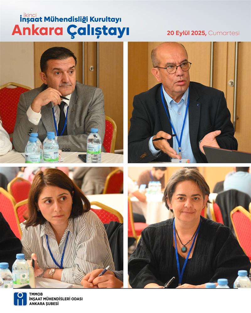 TMMOB İnşaat Mühendisleri Odası tarafından yılsonunda düzenlenecek olan İkinci İnşaat Mühendisliği Kurultayı’na hazırlık kapsamında üyelerimizin görüş ve önerilerini doğrudan kurultaya taşımak amacıyla Ankara Çalıştayı 20 Eylül 2025 Cumartesi günü Çankaya Belediyesi Vedat Dalokay Kokteyl Salonu’nda gerçekleştirildi. Çalıştayın açılış konuşması İMO Ankara Şubesi Yönetim Kurulu Başkanı Ahmet Onur Özergene gerçekleştirmiştir. (Özergene'nin konuşmasının tamamına haberin devamından ulaşabilirsiniz.) Daha sonra İMO Ankara Şubesi Şube Sekreteri Mahir Kaygusuz tarafından çalıştay içeriğine dair bilgilendirme sunumu yapılmış ve masa seçimleri gerçekleştirilmiştir.