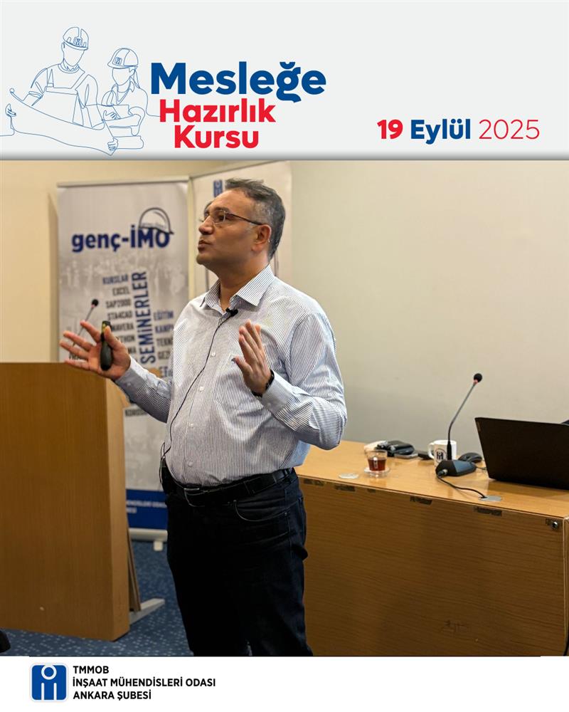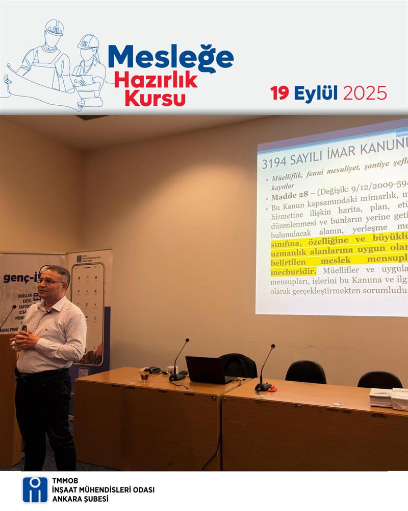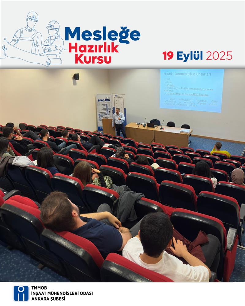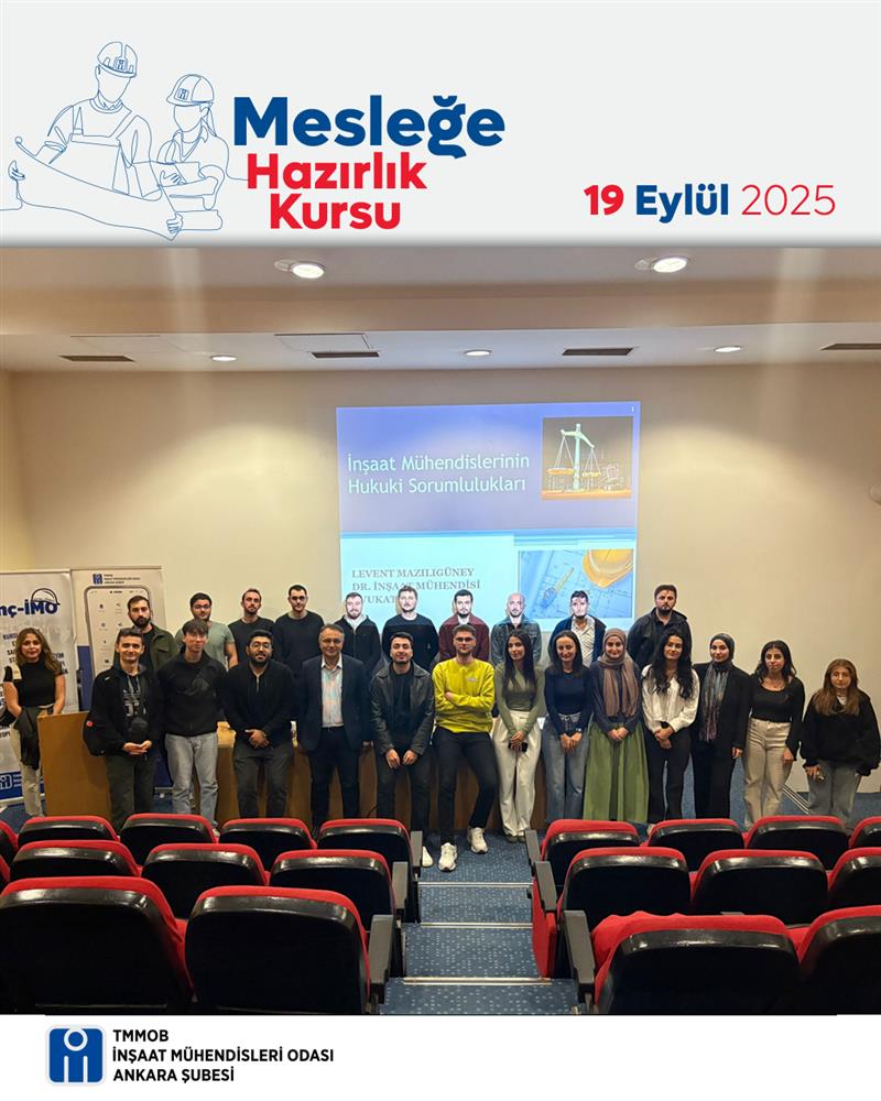 Mesleğe Hazırlık Kursu 2025 kapsamında, 19 Eylül 2025 günü "Meslekte Oluşabilecek Hukuk Sorunları" semineri düzenlendi. İMO Ankara Şubesi Rüştü Özal Salonunda düzenlenen seminer Av. Dr. Levent Mazılıgüney tarafından verildi.