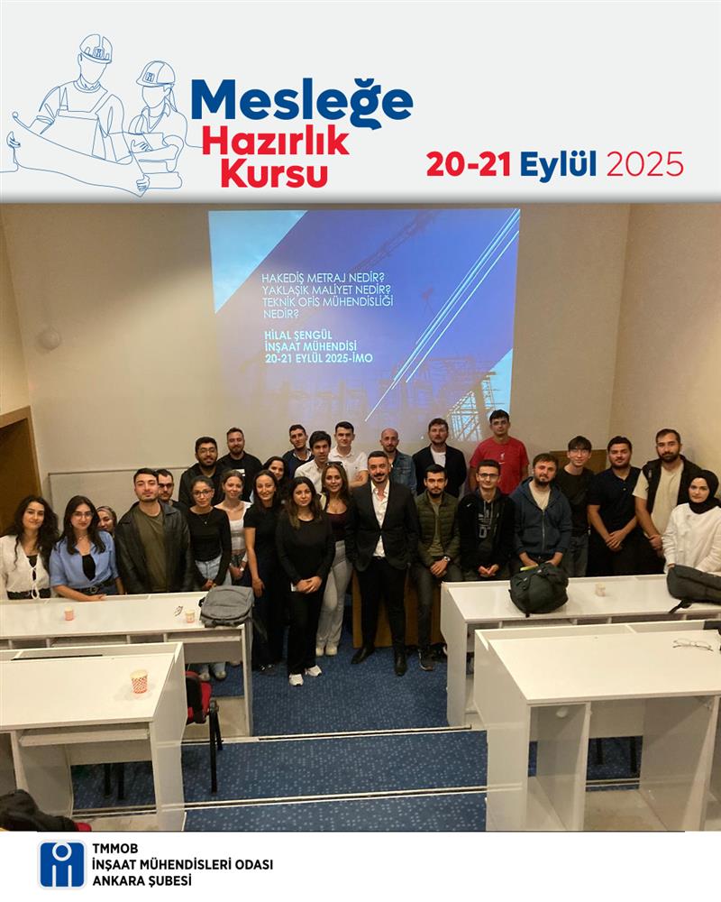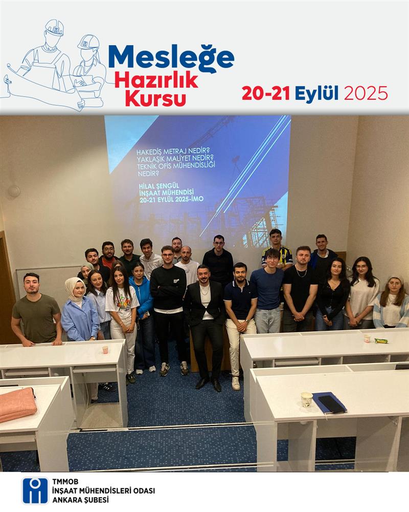 Mesleğe Hazırlık Kursu 2025 kapsamında 20-21 Eylül 2025 tarihlerinde İMO Ankara Şubesi Güney Özcebe Salonu'nda "Hakediş ve Metraj Kursu" düzenlendi.