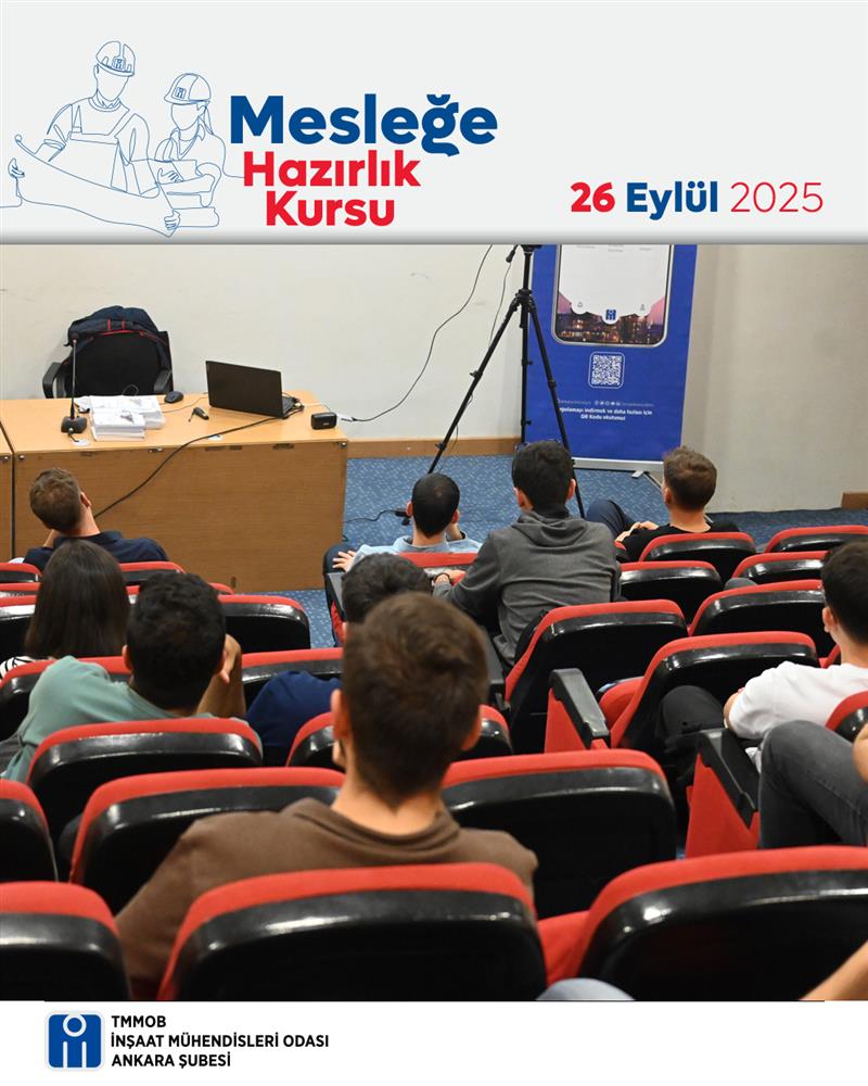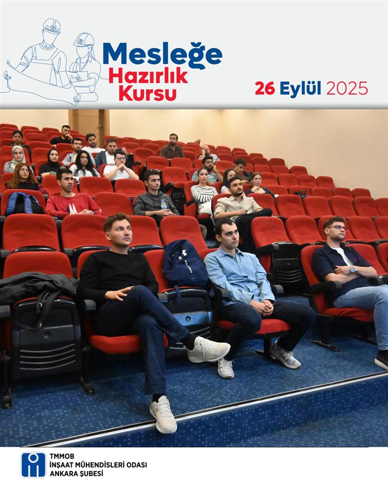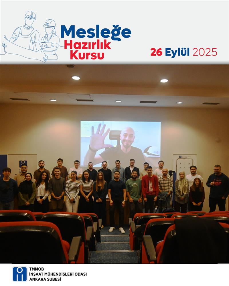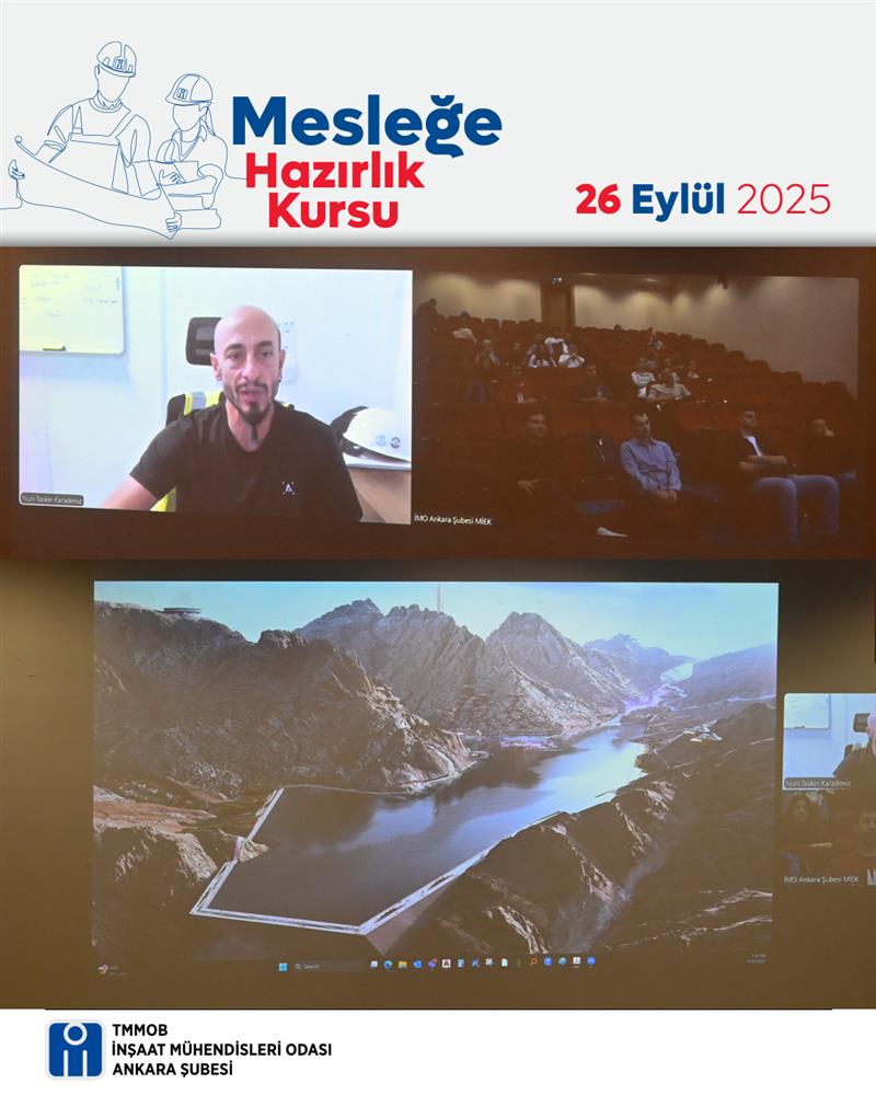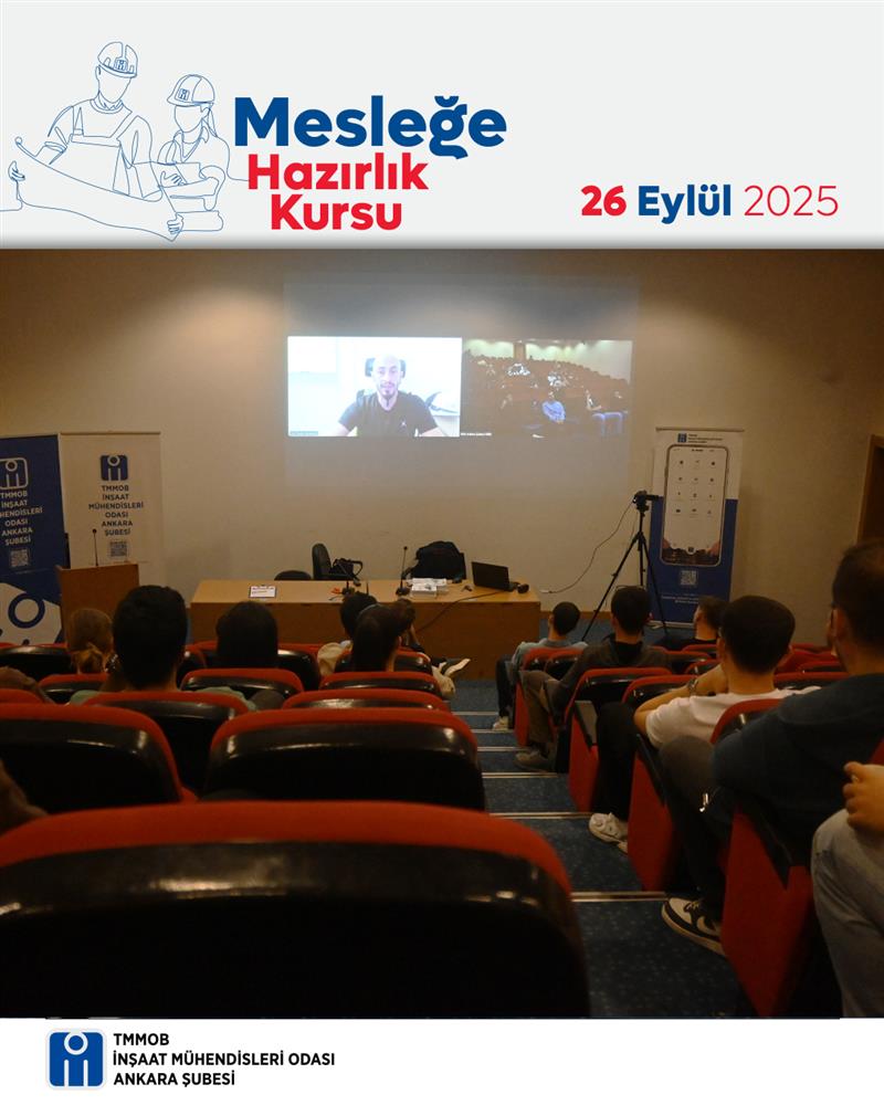 Mesleğe Hazırlık Kursu 2025 kapsamında 26 Eylül 2025 Cuma günü İMO Ankara Şubesi Rüştü Özal Salonu'nda hibrit “Yurtdışında Mühendislik Semineri” düzenlendi. Seminer İnş. Müh. Taşkın Karadeniz tarafından verildi.