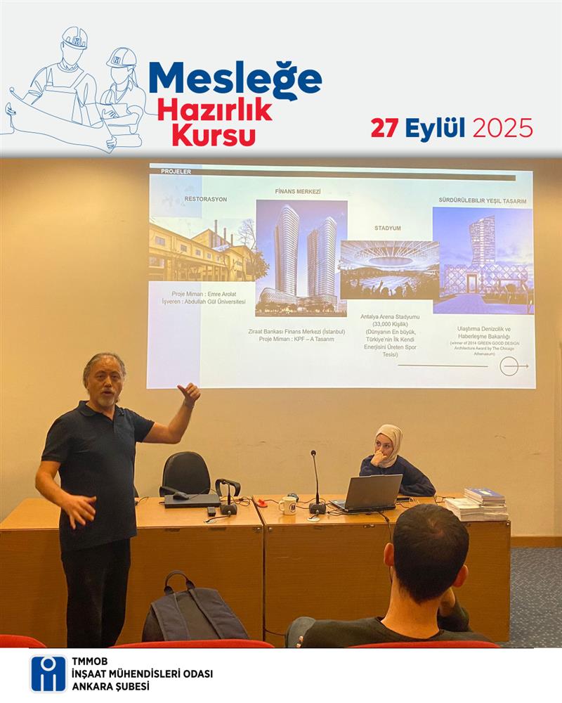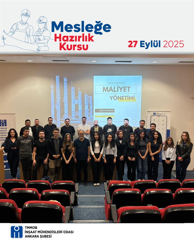 Mesleğe Hazırlık Kursu 2025 kapsamında 27 Eylül 2025 günü "Maliyet Yönetimi Semineri" düzenlendi. İMO Ankara Şubesi Rüştü Özal Salonunda düzenlenen seminer İnş. Müh. Zafer Keskin tarafından verildi.