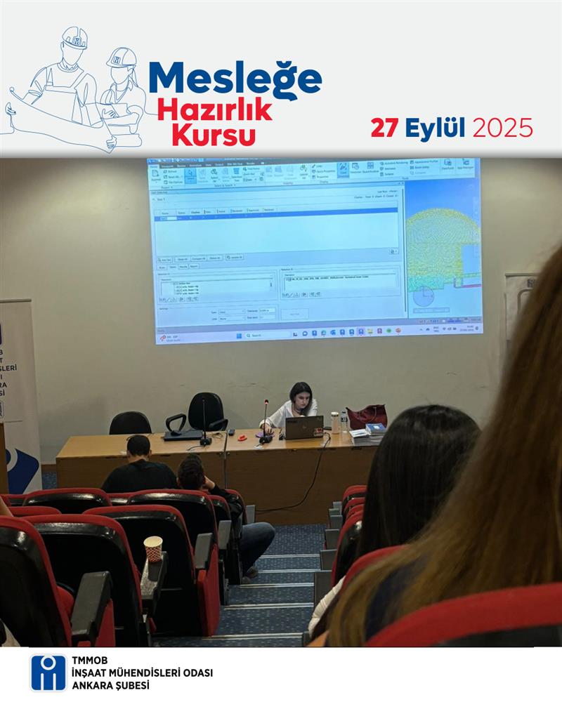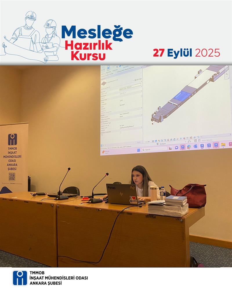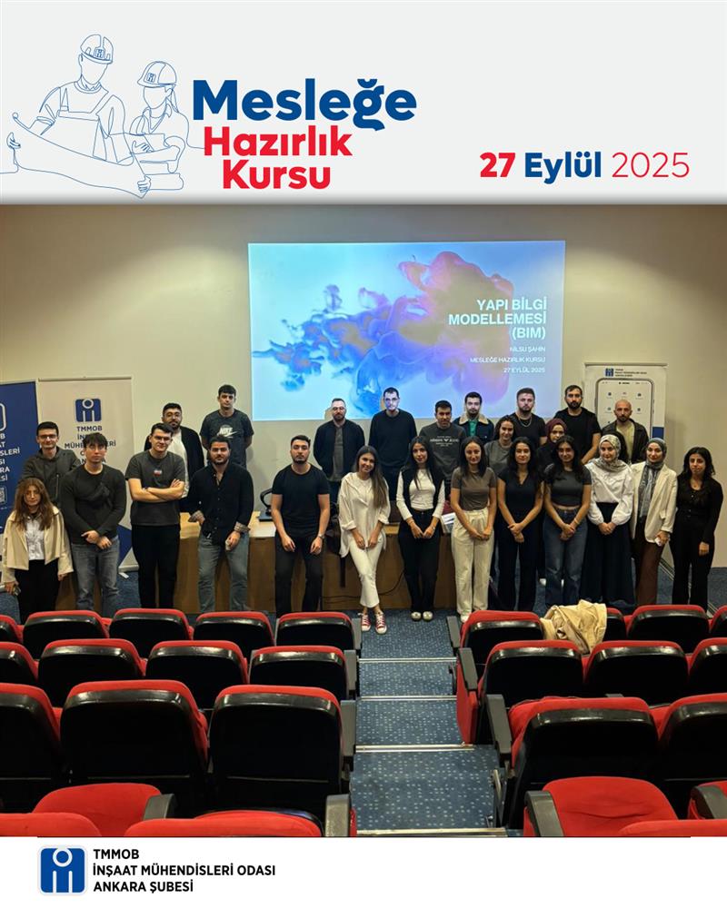 Mesleğe Hazırlık Kursu 2025 kapsamında 27 Eylül 2025 Cumartesi günü “Yapı Bilgi Modellemesi (BIM) Semineri” gerçekleştirildi. İMO Ankara Şubesi Rüştü Özal Salonu’nda düzenlenen seminer, İnş. Müh. Nilsu Şahin tarafından verildi.