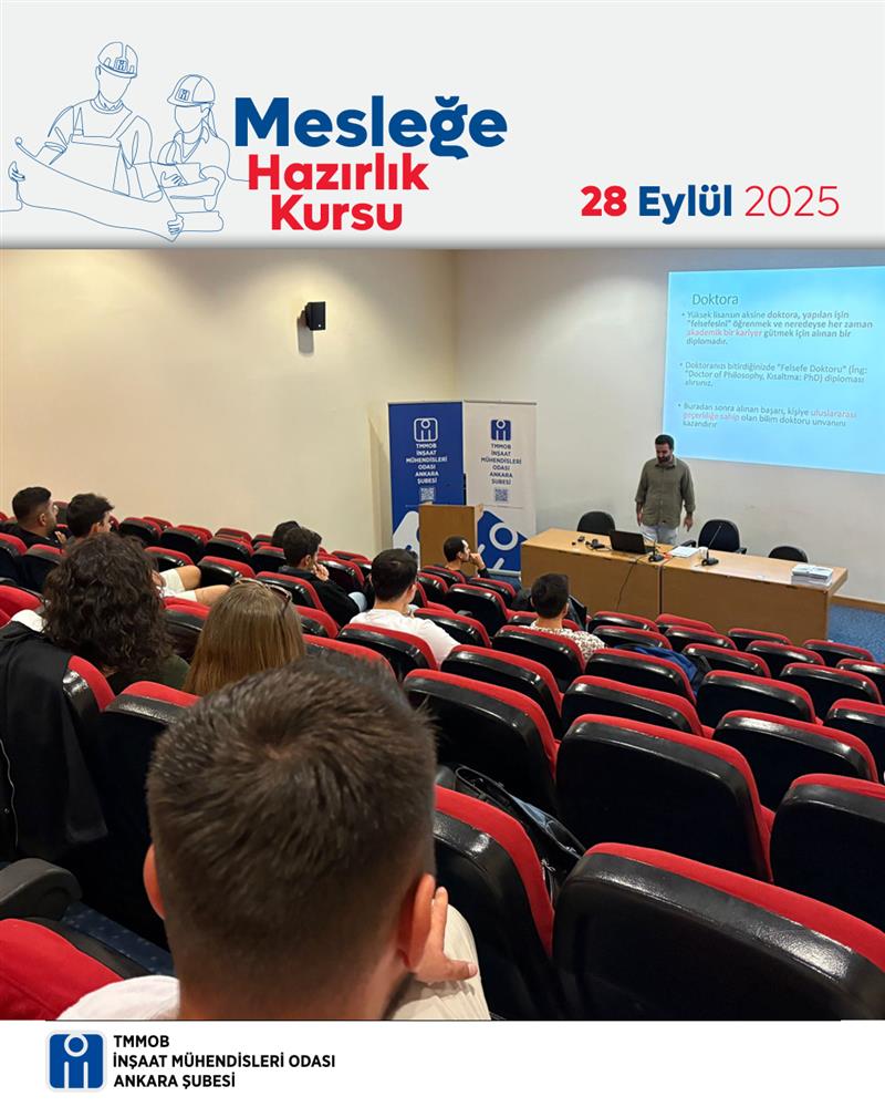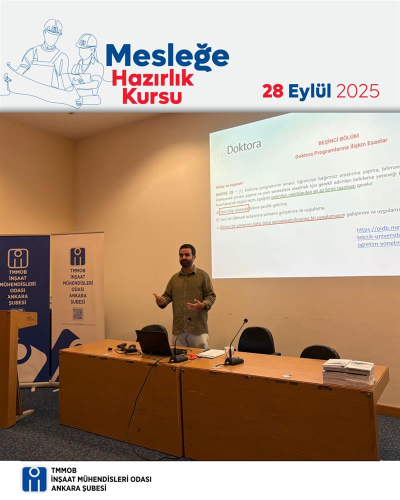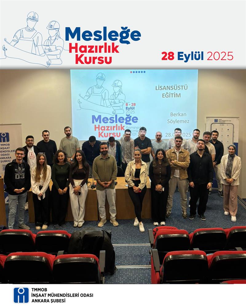 Mesleğe Hazırlık Kursu 2025 kapsamında 28 Eylül 2025 Pazar günü “Lisansüstü Eğitim Semineri” gerçekleştirildi. İMO Ankara Şubesi Rüştü Özal Salonu’nda düzenlenen seminer, İnş. Müh. Berkan Söylemez tarafından verildi.