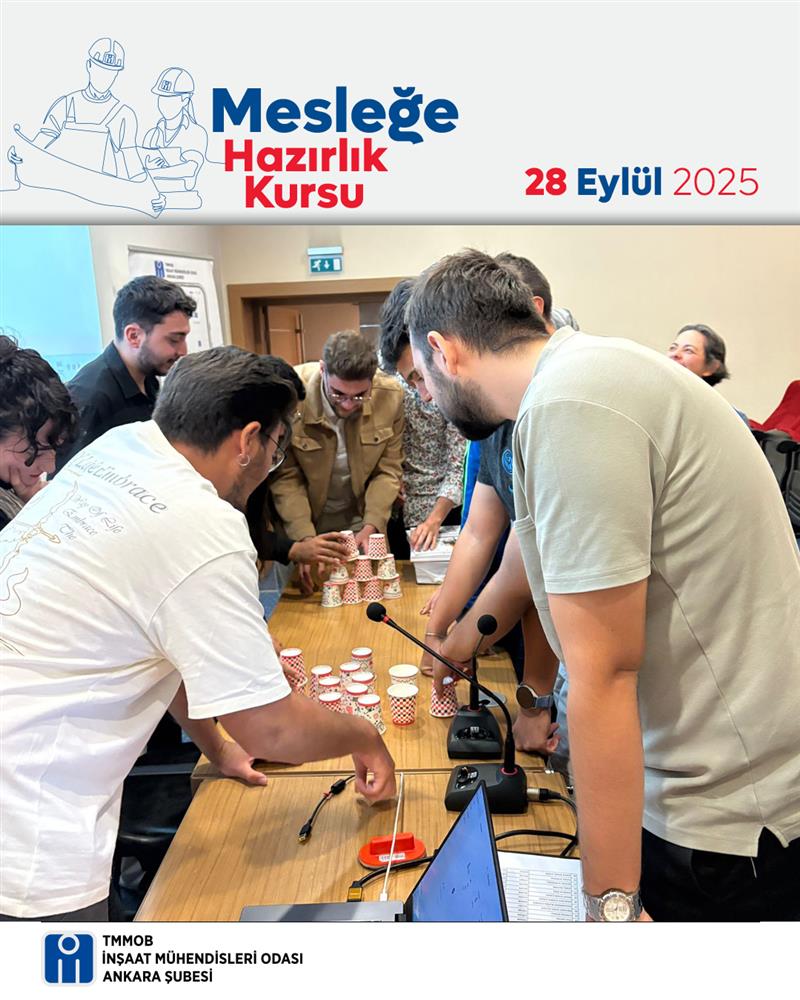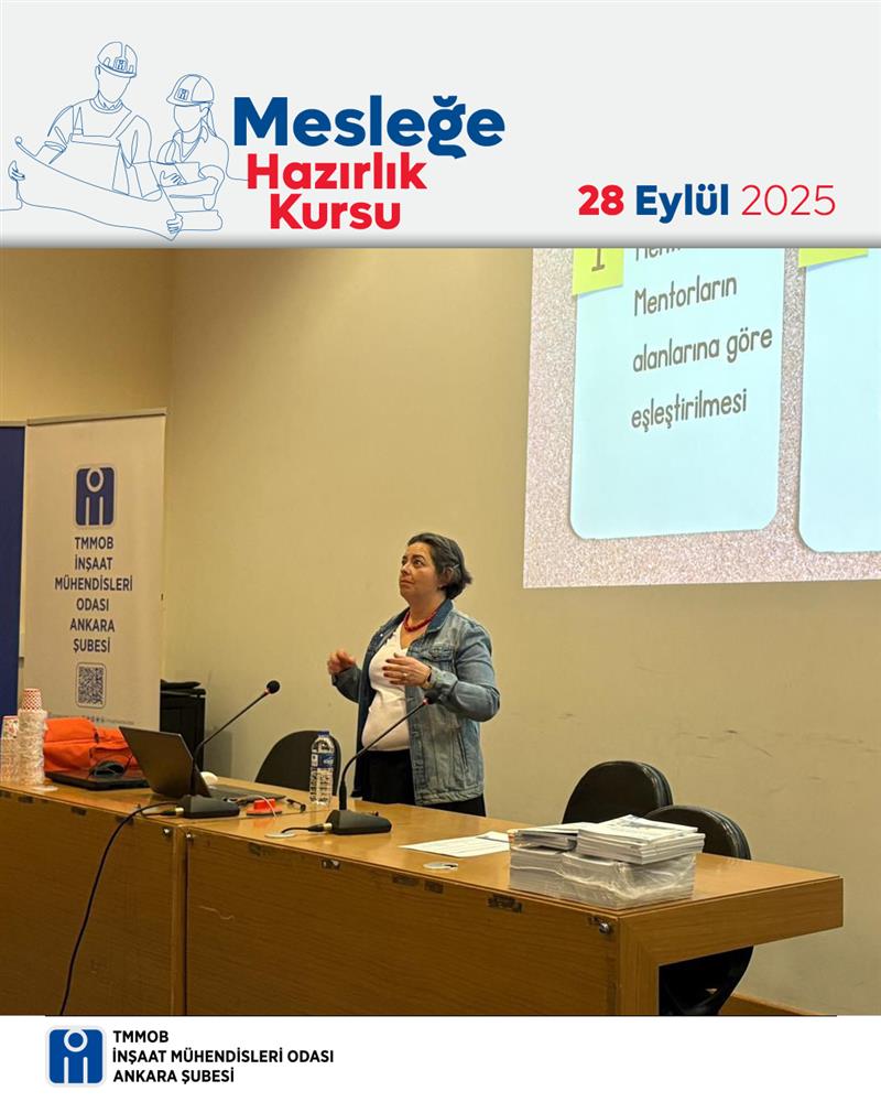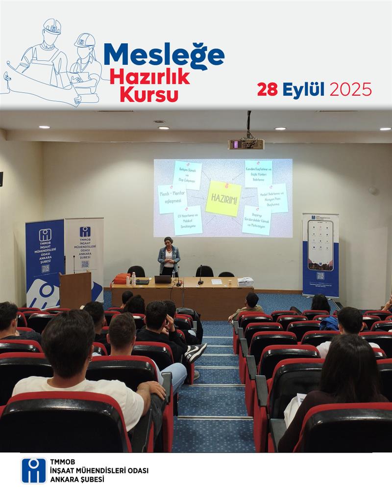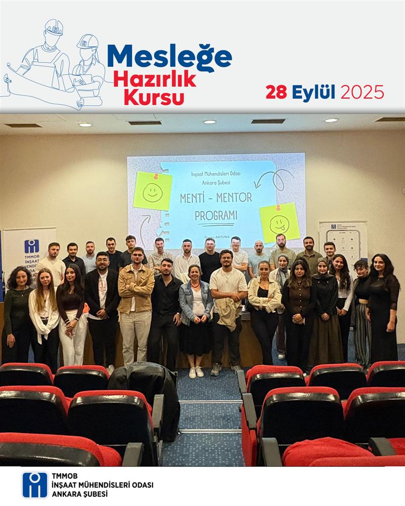Mesleğe Hazırlık Kursu 2025 kapsamında 28 Eylül 2025 Pazar günü “Menti Mentör Semineri” gerçekleştirildi. İMO Ankara Şubesi Rüştü Özal Salonu’nda düzenlenen seminer, İnş. Müh. Duygu Aktuna Geyik tarafından verildi.