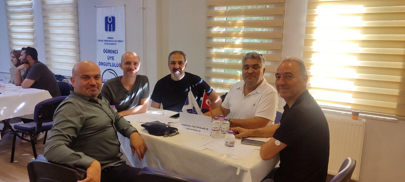 Çalıştay divanı; Aydın Şube Yönetim Kurulu Başkanı Ali Atılım Kahraman, 2.Başkan Serdal Bayar, Yazmanlar Pakize Öz ve Çağatay Özcan’dan oluşturuldu. Çalıştay açılış konuşması Aydın Şube Yönetim Kurulu Başkanı Ali Atılım Kahraman tarafından yapıldı. Geçmiş dönem Şube başkanları Altan Güney, H.Gürkan Yenipazarlı ve Özlenen Alcı, geçmiş dönem Yönetim Kurulu üyeleri, Şubeye bağlı Temsilciler, ADÜ İnşaat Mühendisliği Bölüm Başkanı Prof.Dr. Selman Sağlam, bölüm öğretim görevlisi Prof.Dr. Oral Yağcı, İMO Salihli Temsilcisi Hasan Engin, Eski Aydın Belediye Başkanı İnş.Yük.Müh. Hüseyin Aksu ve genç-imo Aydın sınıf temsilcileri ile üyeler katılmışlardır.