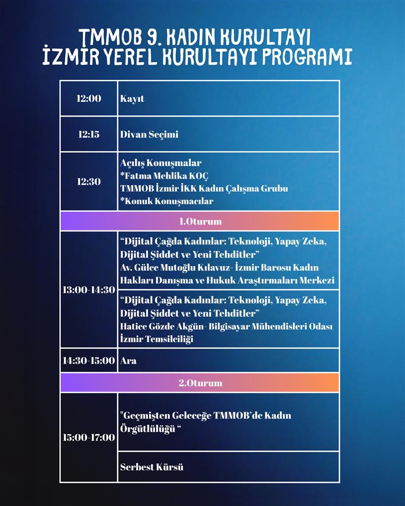 TMMOB 9. Kadın Kurultayı İzmir Yerel Kurultayı 11 Ekim 2025, Cumartesi günü saat 12.00-17.00 arası Elektrik Mühendisleri Odası İzmir Şube'sinde gerçekleştirilecektir.