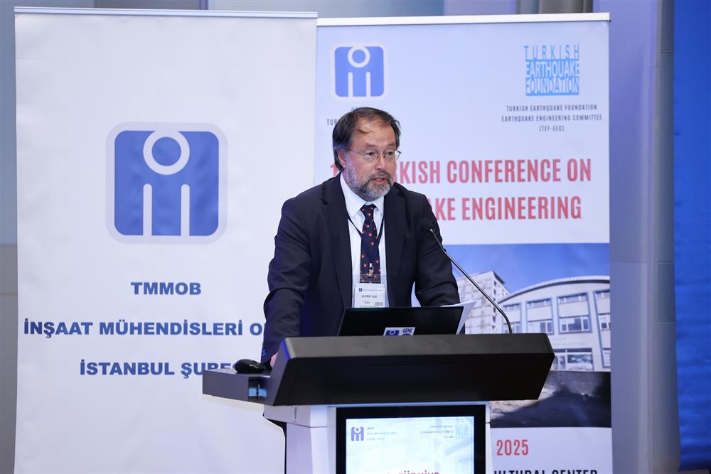 Türkiye Deprem Vakfı Başkanı ve Konferans Eş Başkanı Alper İLKİ konuşmasında, Kahramanmaraş 2023 depremlerinin sonrasında ülkemizde deprem güvenliği, yapı stoku değerlendirmesi ve mühendislik hizmetlerinin niteliği konularında kapsamlı bir yeniden yapılanma süreci başladığını, bu süreçte yürürlüğe giren Afetler Sonrası Bina Hasar Tespiti Yapılmasına İlişkin Genel Kurallar Hakkında Yönetmelik ve şu sıra güncellenmekte olan Türkiye Bina Deprem Yönetmeliği’nin ve hazırlanmakta olan Güçlendirme Yönetmeliğinin bu alanlardaki uygulamalarda uzun süredir hissedilen boşlukları doldurarak standart çerçeveler oluşturmayı hedeflediğini belirtti.