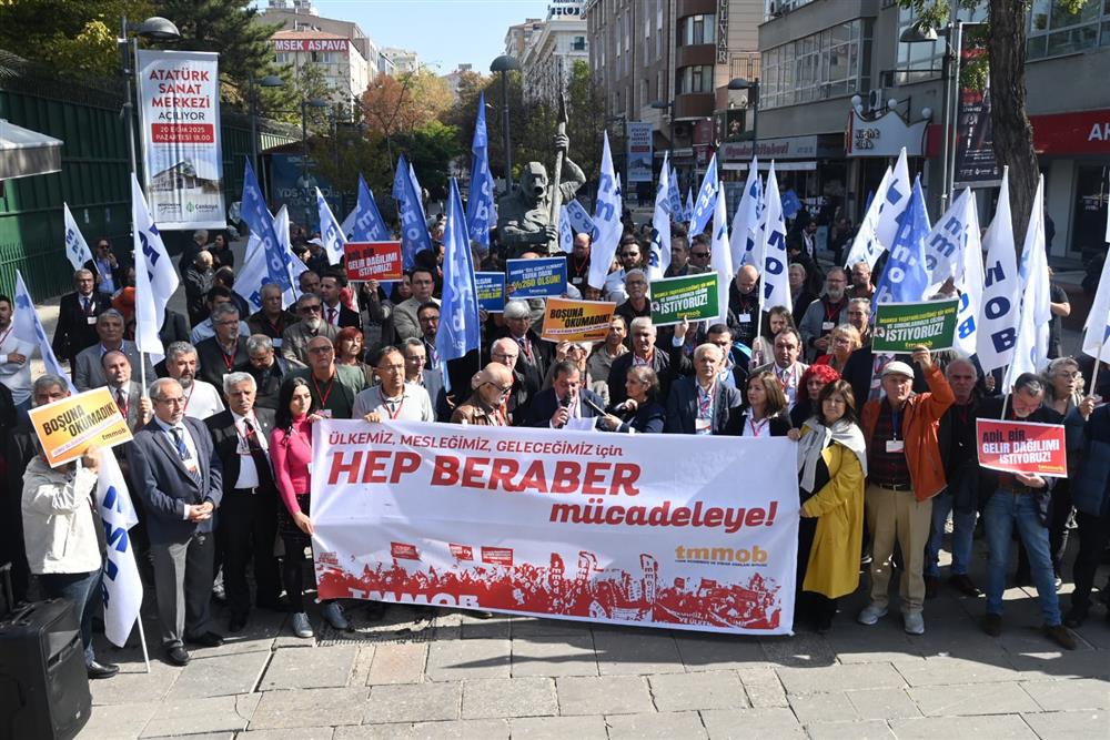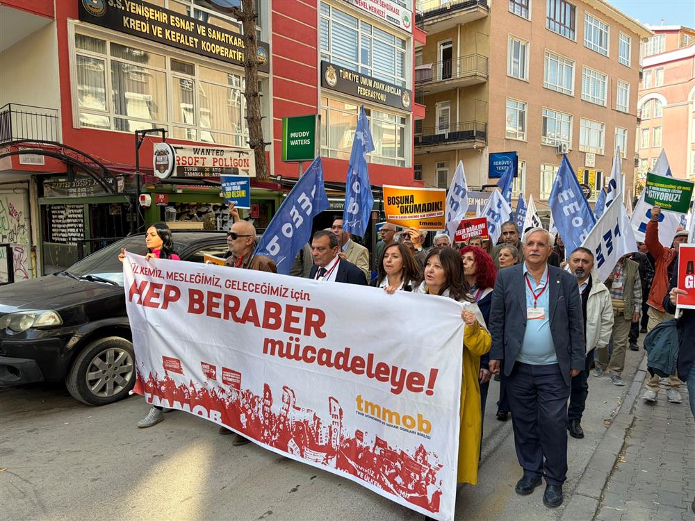 Ülkemizdeki ekonomik, toplumsal ve siyasal krizlerin meslektaşlarımıza ve meslek alanlarımıza etkilerinin ve bu bağlamda yaşanan sorunları gündeme getirmek amacıyla MMO Eğitim ve Kültür Merkezi'nden Madenci Anıtı'na yürünerek burada bir basın açıklaması gerçekleştirildi.
