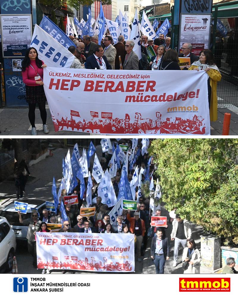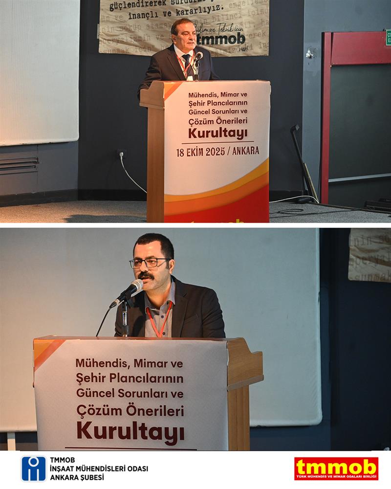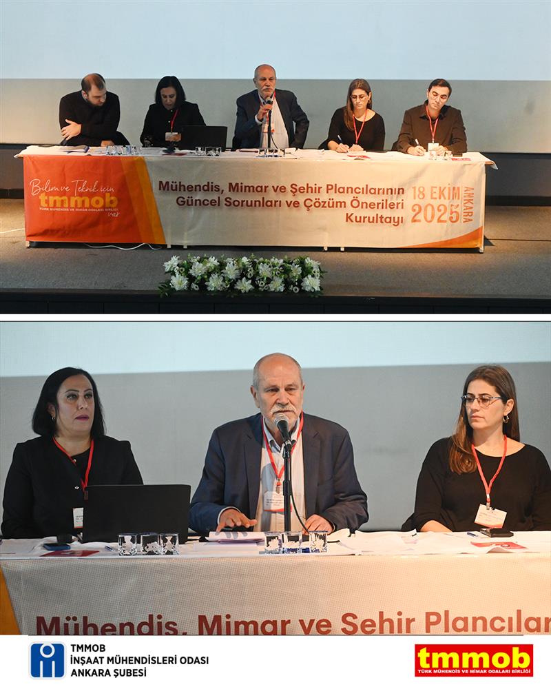 “TMMOB Mühendis, Mimar ve Şehir Plancılarının Güncel Sorunları ve Çözüm Önerileri Kurultayı”, meslektaşlarımızın çalışma yaşamlarında ve sosyal hayatta uğradıkları hak kayıplarını, değersizleştirmeyi ve mesleklerimizin ülkemiz için önemini gündeme getirmek amacıyla, 18 Ekim 2025’te Ankara’da merkezi olarak gerçekleştirildi