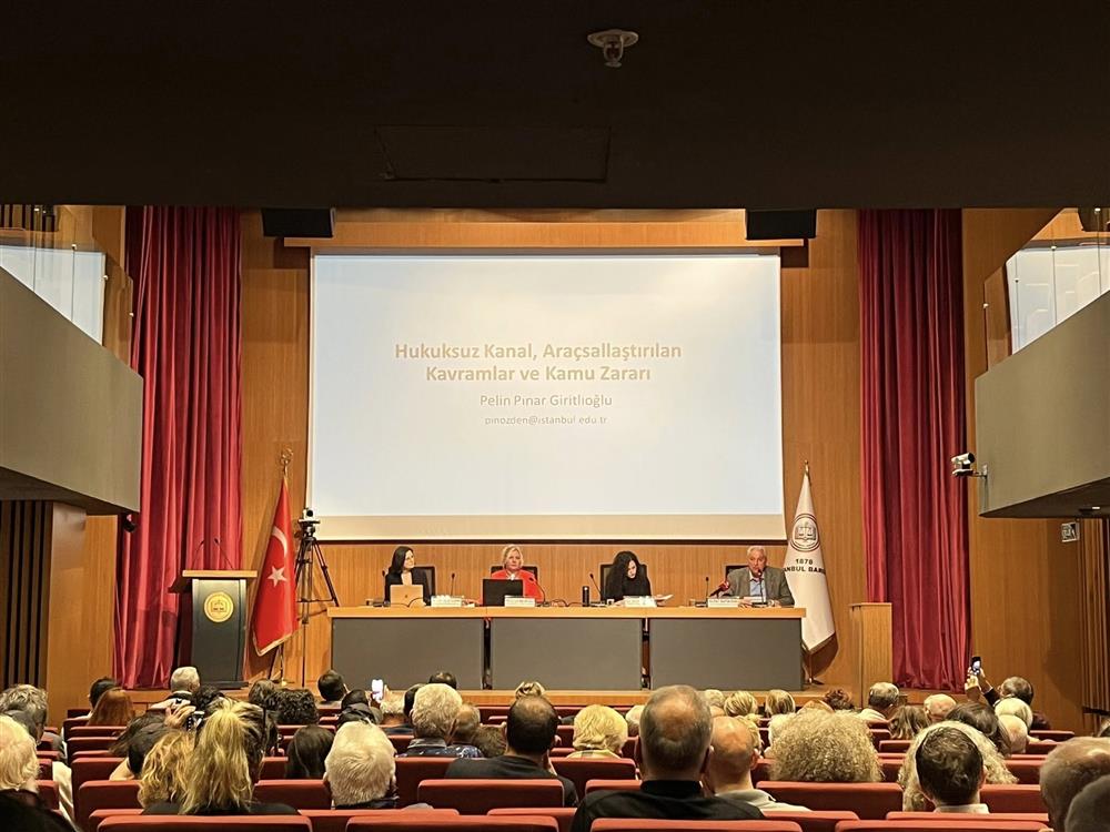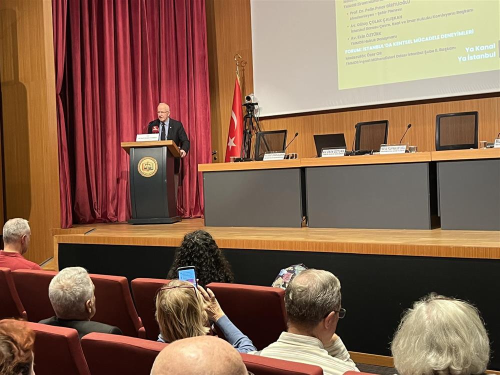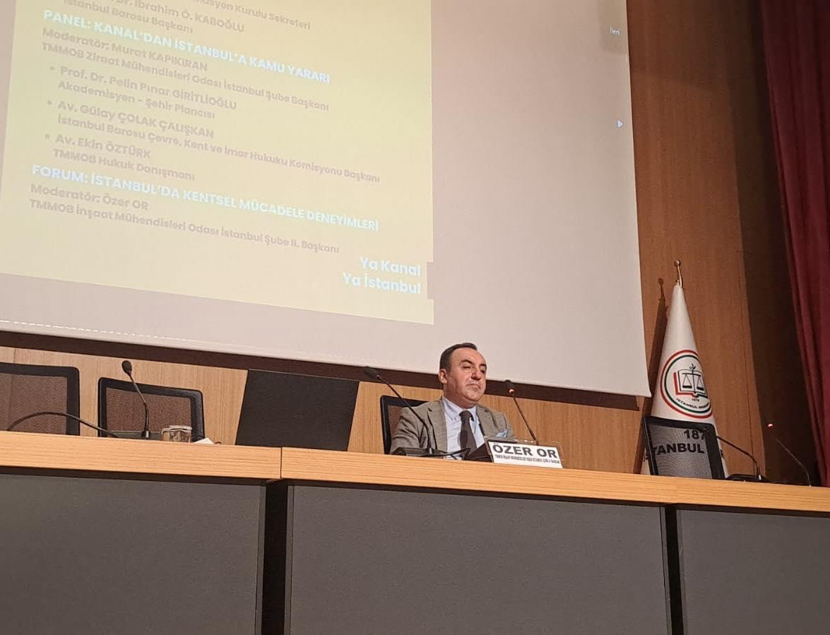 TMMOB İstanbul İl Koordinasyon Kurulu ve İstanbul Barosu tarafından düzenlenen “Kanal’dan İstanbul’a Kamu Yararını Tartışıyoruz” başlıklı Panel-Forum İstanbul Barosu Konferans Salonu’nda gerçekleşti. Panelde, kentin ve ülkenin başlıca gündem maddelerinden biri olmaya devam eden ve İstanbul’un geleceğini derinden etkileyebilecek Kanal İstanbul ve Yenişehir Projesinin başlangıcından itibaren taşıdığı riskler ele alındı ve, Kanal İstanbul’un kamu yararı mı yoksa kamu zararı mı olduğu, kentsel yönetimdeki belirsizliklerin kritik yatırımları nasıl felç edebileceği ve 'sadece ucuz ev' yaklaşımının sosyal konut tanımını karşılayıp karşılamadığı, artan yaşam maliyetleri ve TOKİ'nin gettolaşma risklerini göz ardı edip etmediği, İstanbul'un sınırlı önemli su kaynaklarından Sazlıdere Barajı gibi doğal yaşam kaynaklarının yok edilmesi; kent için su, gıda ve ekolojik güvenliği nasıl tehlikeye atabileceği üzerinde duruldu. Panelin “İstanbul’da Kentsel Mücadele Deneyimleri” başlıklı Forum bölümü Şube Yönetim Kurulu 2.Başkanımız Özer OR’un moderatörlüğünde gerçekleşti. Panele Şube Yönetim Kurulu Yedek Üyemiz Cihangir NUHOĞLU da katıldı.