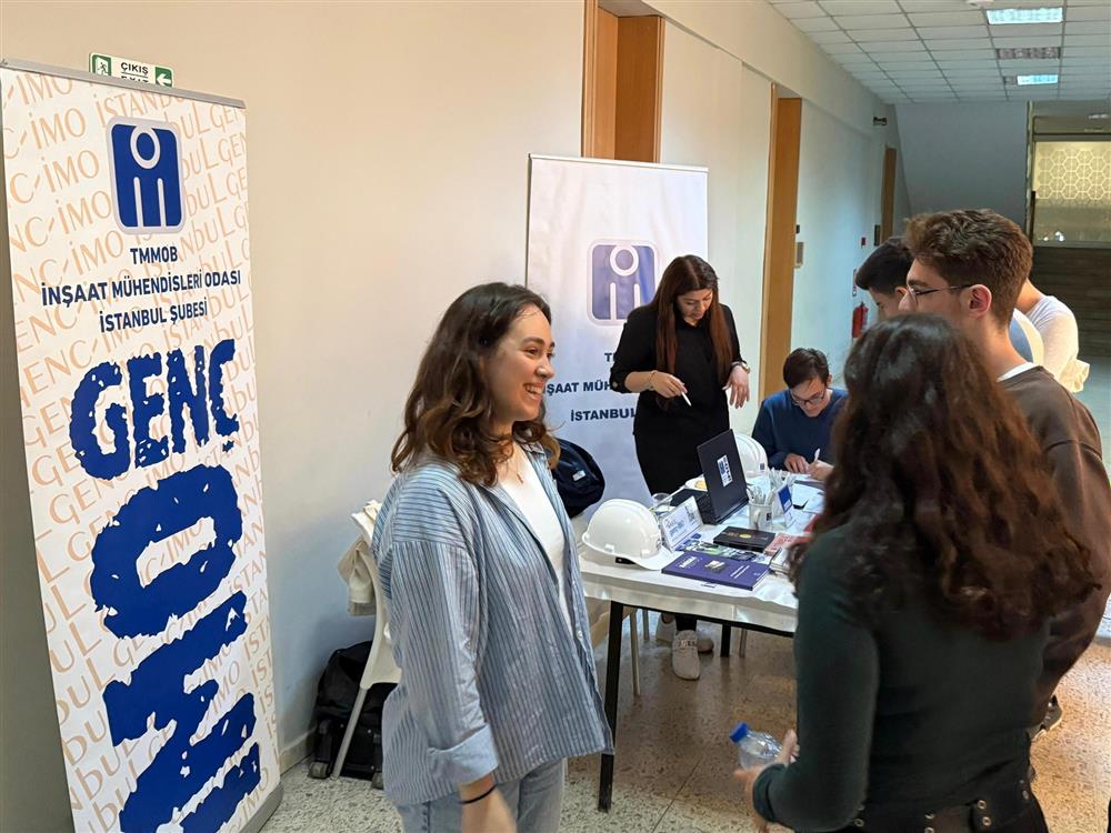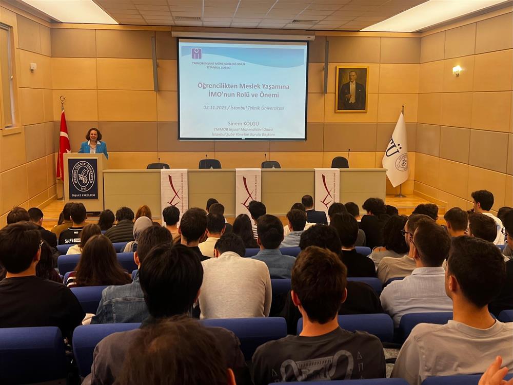 İstanbul Teknik Üniversitesi Mühendisliğe Hazırlık Kulübü tarafından düzenlenen “Mühendisliğe Hazırlık’26” başlıklı etkinlik 2 Kasım 2025 tarihinde İTÜ İnşaat Fakültesi Prof. Nahit Kumbasar Konferans Salonu'nda gerçekleştirildi. Etkinlikte Şube Başkanımız Sinem KOLGU, “Öğrencilikten Meslek Yaşamına İMO'nun Rolü ve Önemi” başlıklı sunumu ile konuşmacı olarak katıldı. KOLGU, inşaat mühendisliği mesleği, eğitimi, İnşaat Mühendisleri Odası ve genç-İMO’ya yönelik bilgilendirmelerde bulundu. Konuşmalar sonrasında Şubemiz tarafından öğrencilere baret hediye edildi. Etkinlik alanında kurulan genç-İMO standı ile katılımcılara Şubemiz tarafından yeni üyelikler alındı ve öğrencilere meslek odaları hakkında bilgi verildi. Etkinliğe Şube Yönetim Kurulu Yedek Üyemiz Hüseyin ÇINAR, Şubemiz Araştırma Görevlileri Gizem BÜLBÜL ve Feyza Gül AKTAŞ, genç-İMO İstanbul Üyemiz Sılanur KAÇDI katıldı.