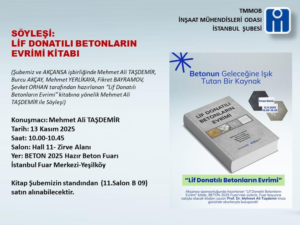 Türkiye Hazır Beton Birliği ve TG Expo ortaklığı ile 12-15 Kasım 2025 tarihlerinde BETON 2025 Hazır Beton Fuarı İstanbul Fuar Merkezi-Yeşilköy’de düzenlenmektedir. Fuar kapsamında, 13 Kasım 2025 tarihinde Saat: 10.00-10.45’de (Hall 11- Zirve Alanı), Şubemiz ve AKÇANSA işbirliğinde Mehmet Ali TAŞDEMİR, Burcu AKÇAY, Mehmet YERLİKAYA, Fikret BAYRAMOV, Şevket ORHAN tarafından hazırlanan “Lif Donatılı Betonların Evrimi” kitabına yönelik Mehmet Ali TAŞDEMİR ile bir söyleşi gerçekleşecektir. Kitap Şubemizin standından (11.Salon B 09) satın alınabilecektir.