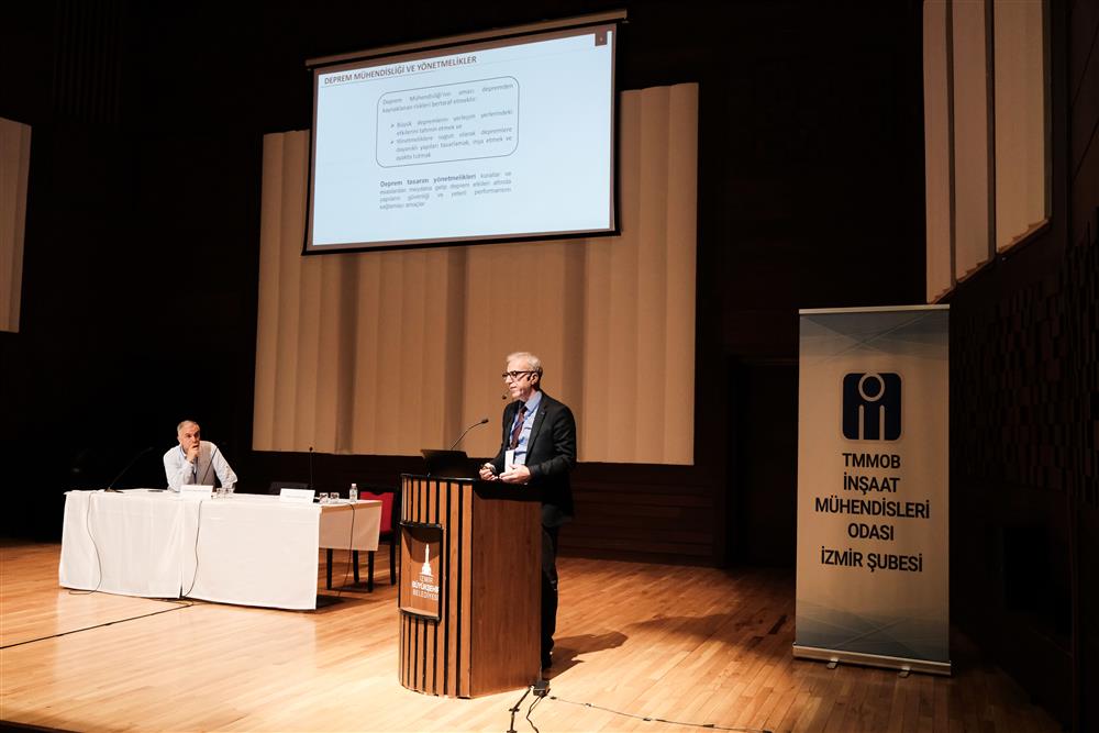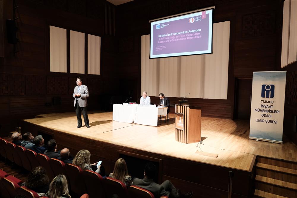 Moderatörlüğünü Prof. Dr. Celalettin Dönmez'in üstlendiği iki oturumluk etkinliğin ilk oturumunda, İzmir yapı stoğu envanter çalışmaları kapsamında güçlendirme alternatifleri konulu sunumları Prof. Dr. Barış Binici ve Prof. Dr. Erdem Canbay yaptı.