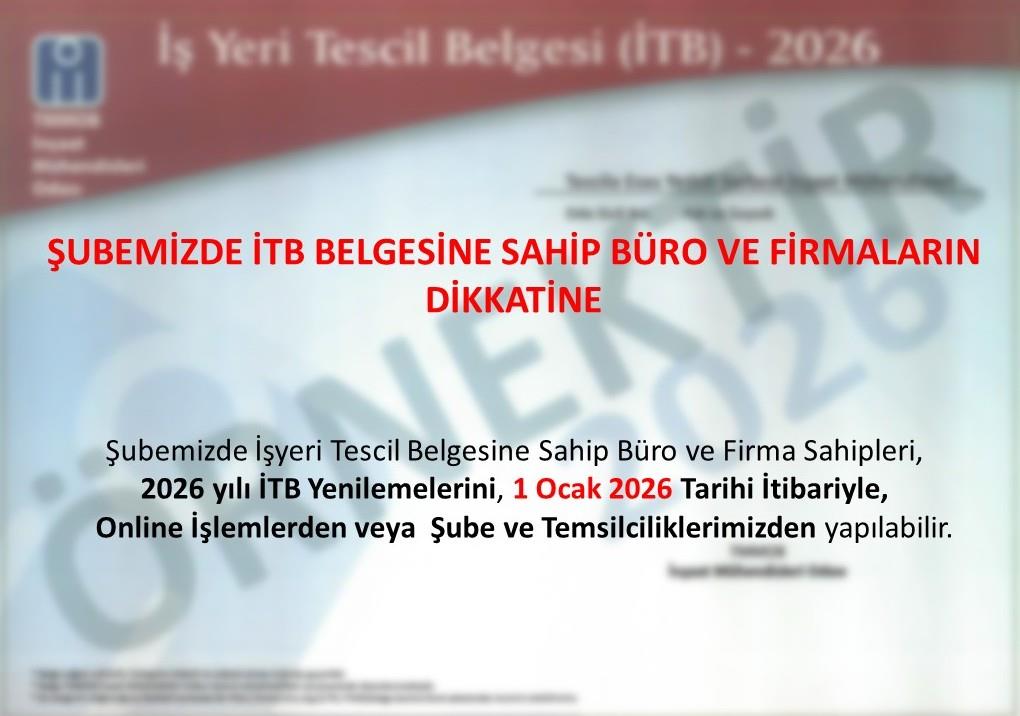 ŞUBEMİZDE İTB BELGESİNE SAHİP BÜRO VE FİRMALARIN DİKKATİNE,
