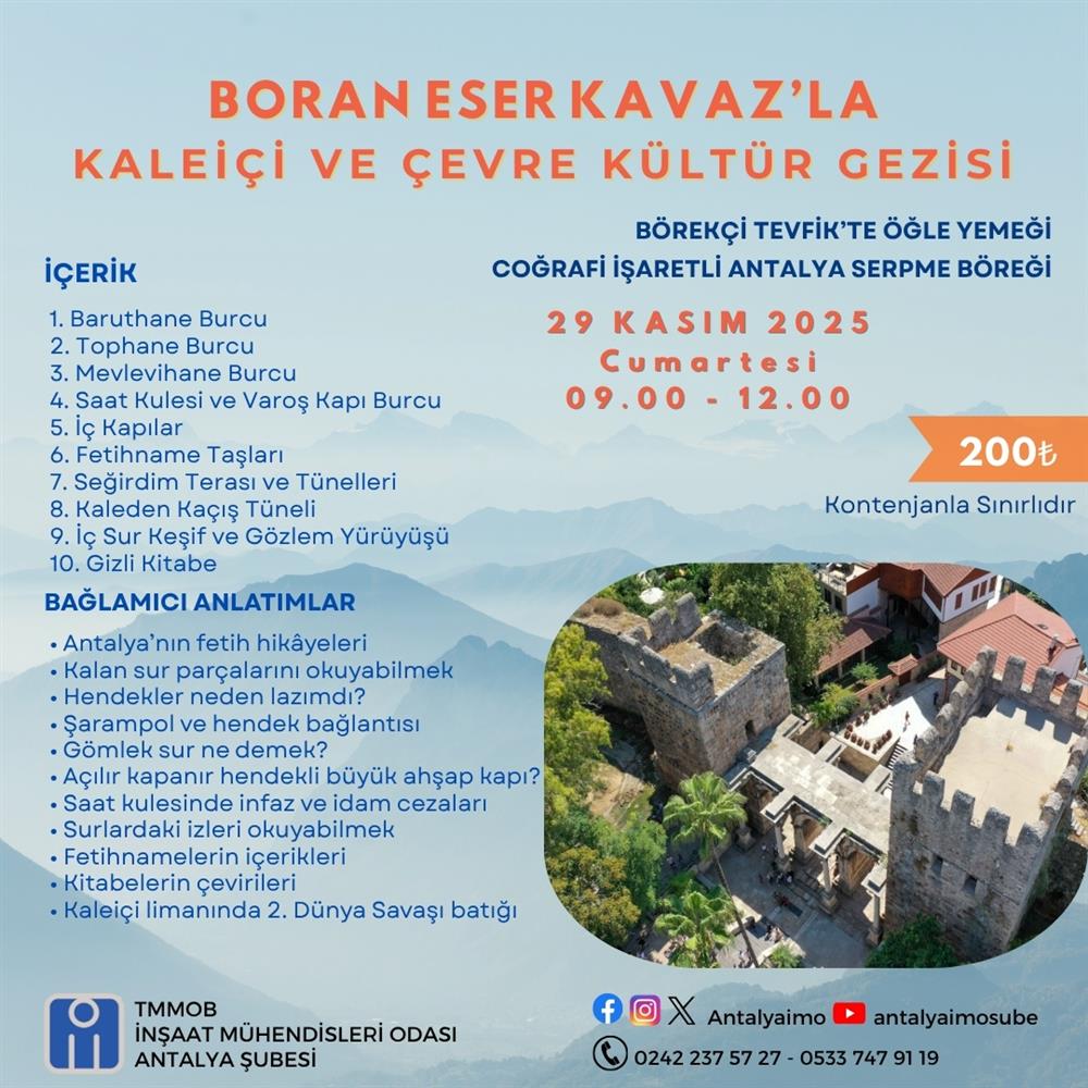 Şubemiz tarafından düzenlenen Boran Eser Kavaz’la Kaleiçi ve Çevre Kültür Gezisi (Kaleiçi Sur, Kapı ve Hendekleri Seğirdim ve Kaçış Tünelleri Kitabeler ve Fetihnameler) katılmak isteyen üyelerimiz, 27 Kasım 2025 Perşembe günü saat 17.00’ye kadar isimlerini yazdırabilirler. Gezimiz kontenjanla sınırlıdır.