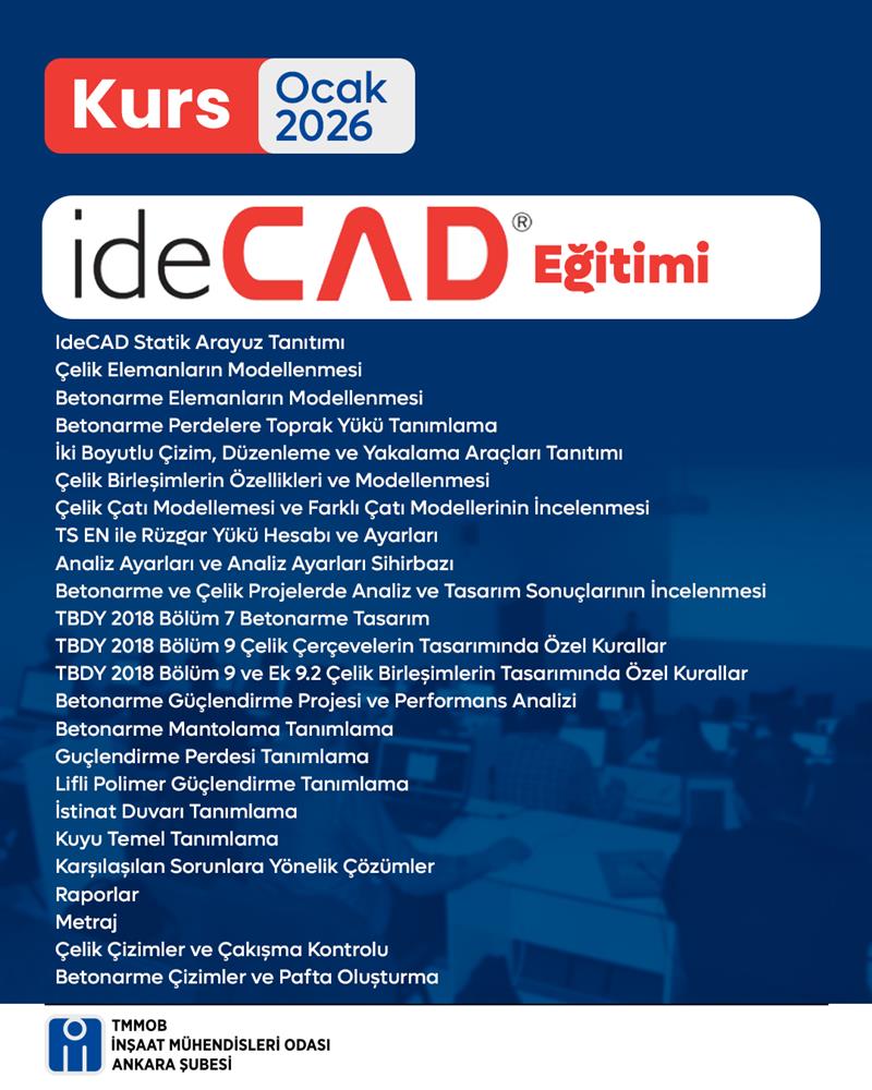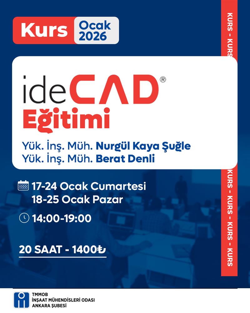 17–18–24–25 Ocak 2026 tarihlerinde, Şubemiz tarafından 0–5 yıllık mezuniyet yılına sahip üyelerimize öncelik verilerek “ideCAD Eğitimi” düzenlenecektir. Yük. İnş. Müh. Nurgül Kaya Şuğle ve Yük. İnş. Müh. Berat Denli tarafından verilecek eğitim için kayıtlar 9 Ocak Cuma günü kapanacaktır.