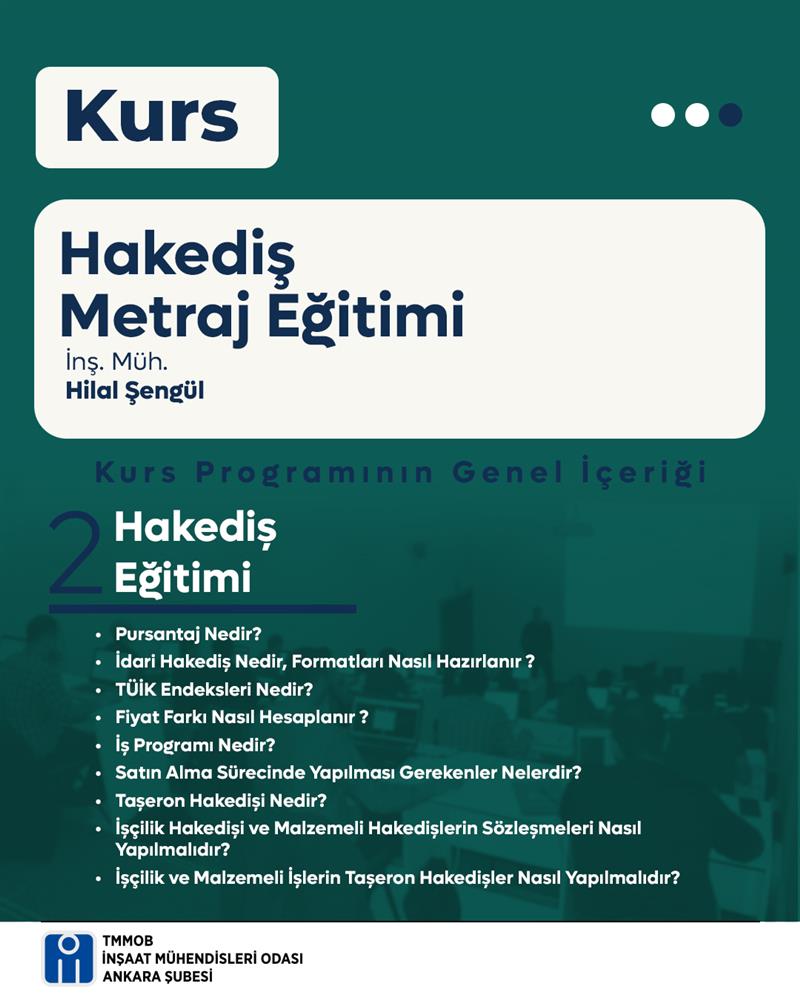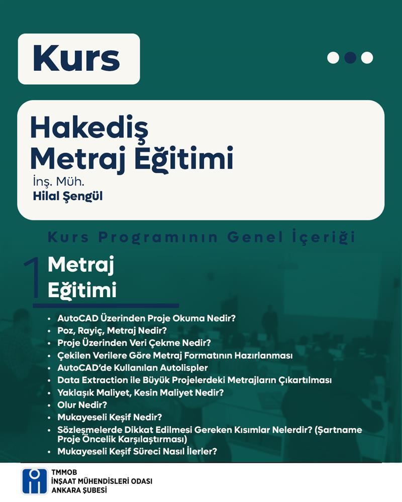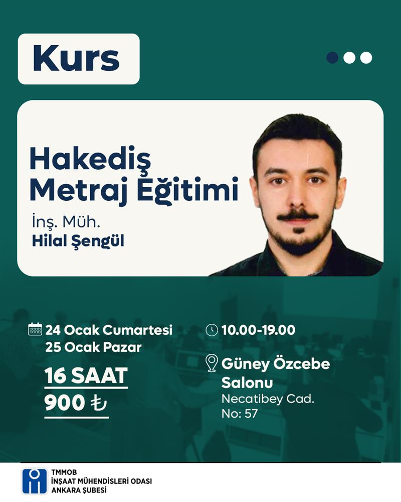 24-25 Ocak 2026 tarihlerinde Şube binamızda “Hakediş Metraj Eğitimi” düzenlenecektir. Eğitim 16 saat sürecektir.