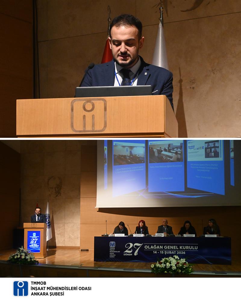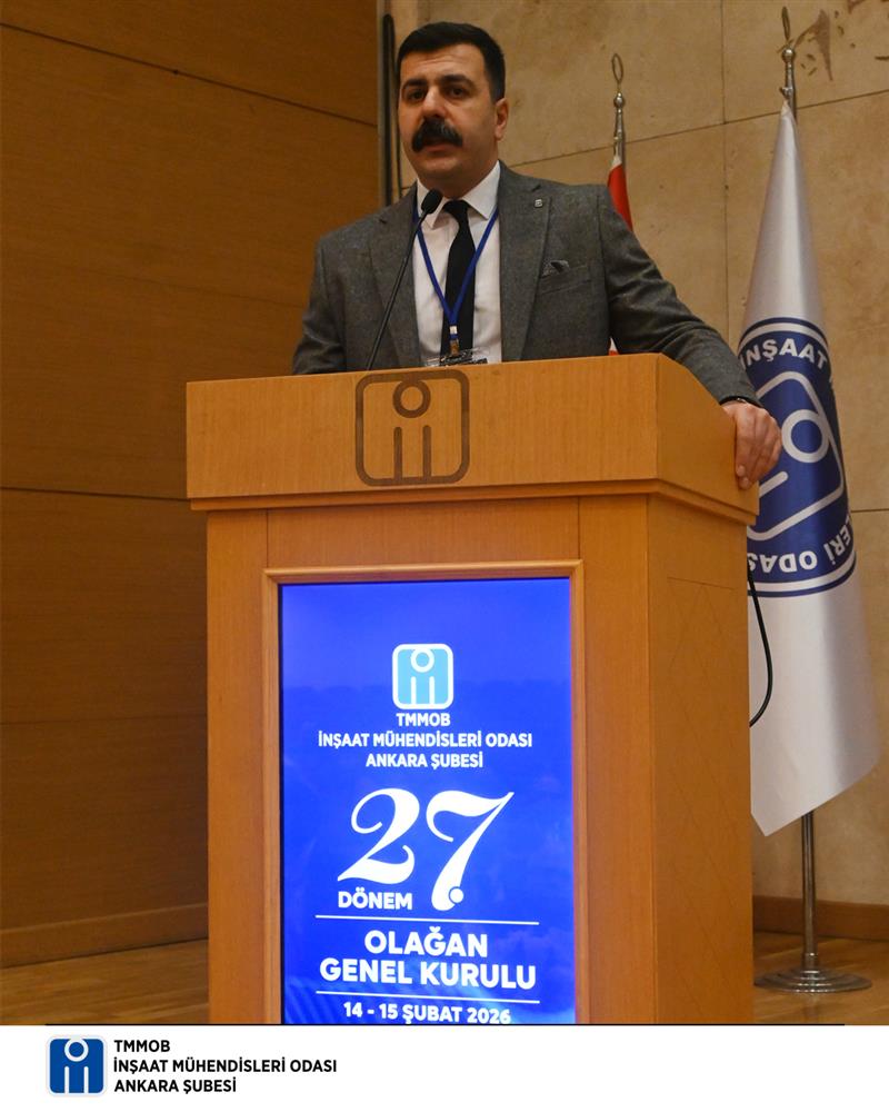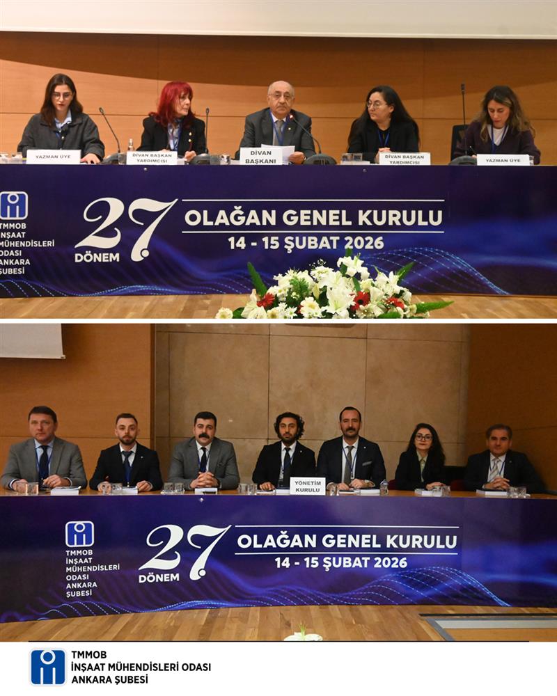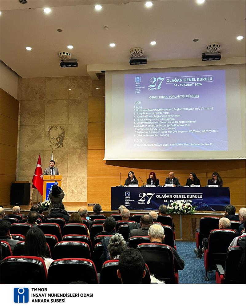 İnşaat Mühendisleri Odası Ankara Şubesi 27. Olağan Genel Kurulu, 14 Şubat 2026 Cumartesi günü İnşaat Mühendisleri Odası Kültür ve Kongre Merkezi Teoman Öztürk Salonu'nda yapıldı
