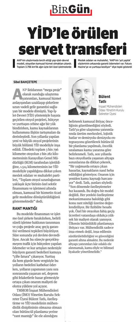 TMMOB İnşaat Mühendisleri Odası Yönetim Kurulu Sekreter Üyesi Bülent Tatlı, ulaştırma altyapısında Yap-İşlet-Devret modeli ve kamuya getirdiği yükler konusunda BirGün gazetesine açıklamalarda bulundu.