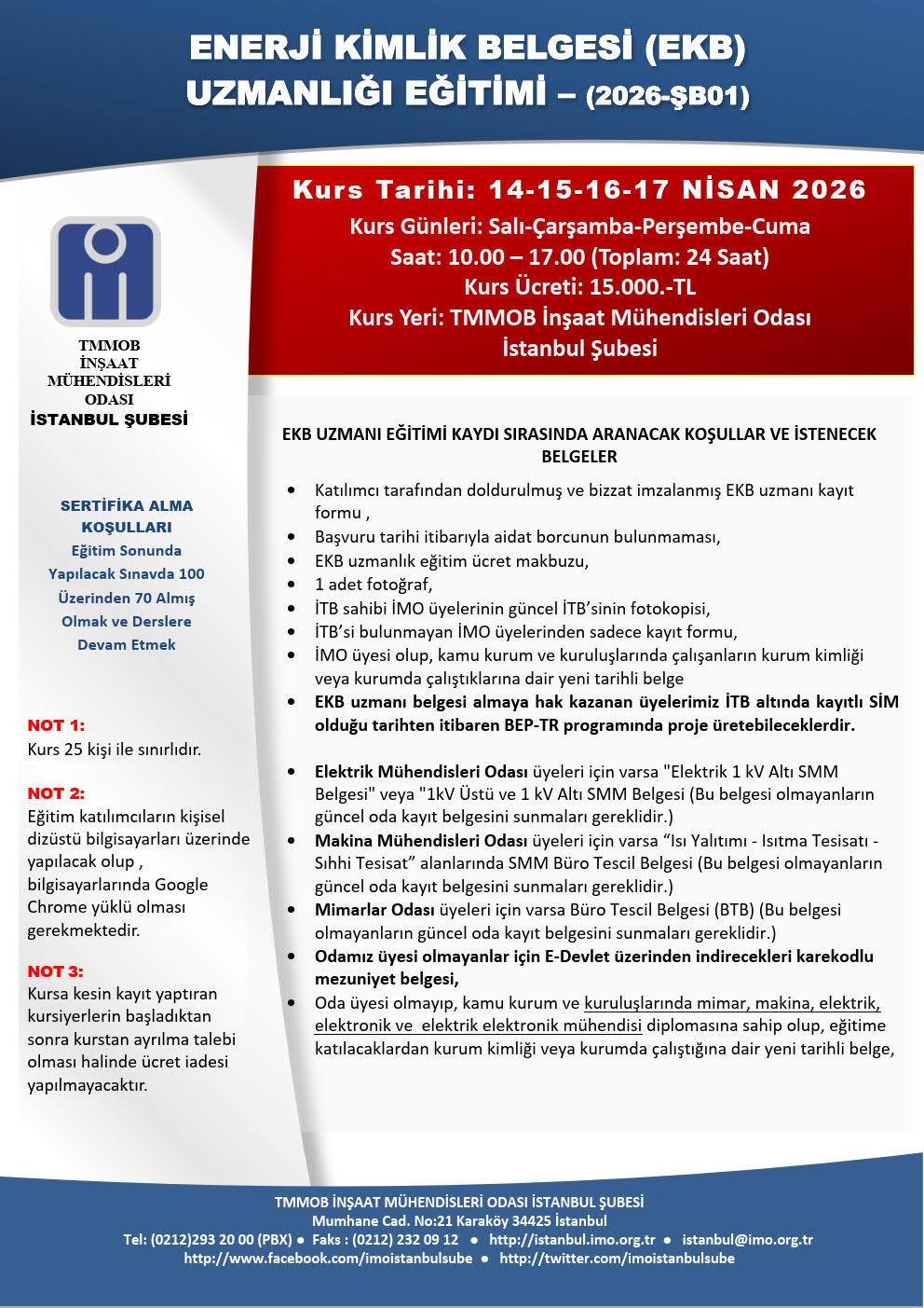 Kurs Tarihi: 14-15-16-17 Nisan 2026Kurs Günleri: Salı-Çarşamba-Perşembe-CumaSaat: 10.00 – 17.00 (Toplam: 24 Saat)Kurs Ücreti: 15.000.-TLKurs Yeri: TMMOB İnşaat Mühendisleri Odasıİstanbul ŞubesiTel: 0212 2932000 (PBX)Kayıt için: Şube ve Temsilciliklerimize başvurabilirsiniz.1-EKB-kayıt-formu.docx