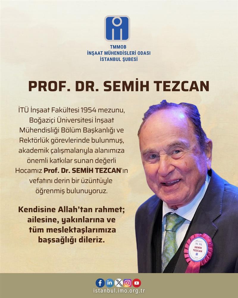 İTÜ İnşaat Fakültesi 1954 mezunu, Boğaziçi Üniversitesi İnşaat Mühendisliği Bölüm Başkanlığı ve Rektörlük görevlerinde bulunmuş, akademik çalışmalarıyla alanımıza önemli katkılar sunan değerli Hocamız Prof. Dr. SEMİH TEZCAN’ın vefatını derin bir üzüntüyle öğrenmiş bulunuyoruz.
