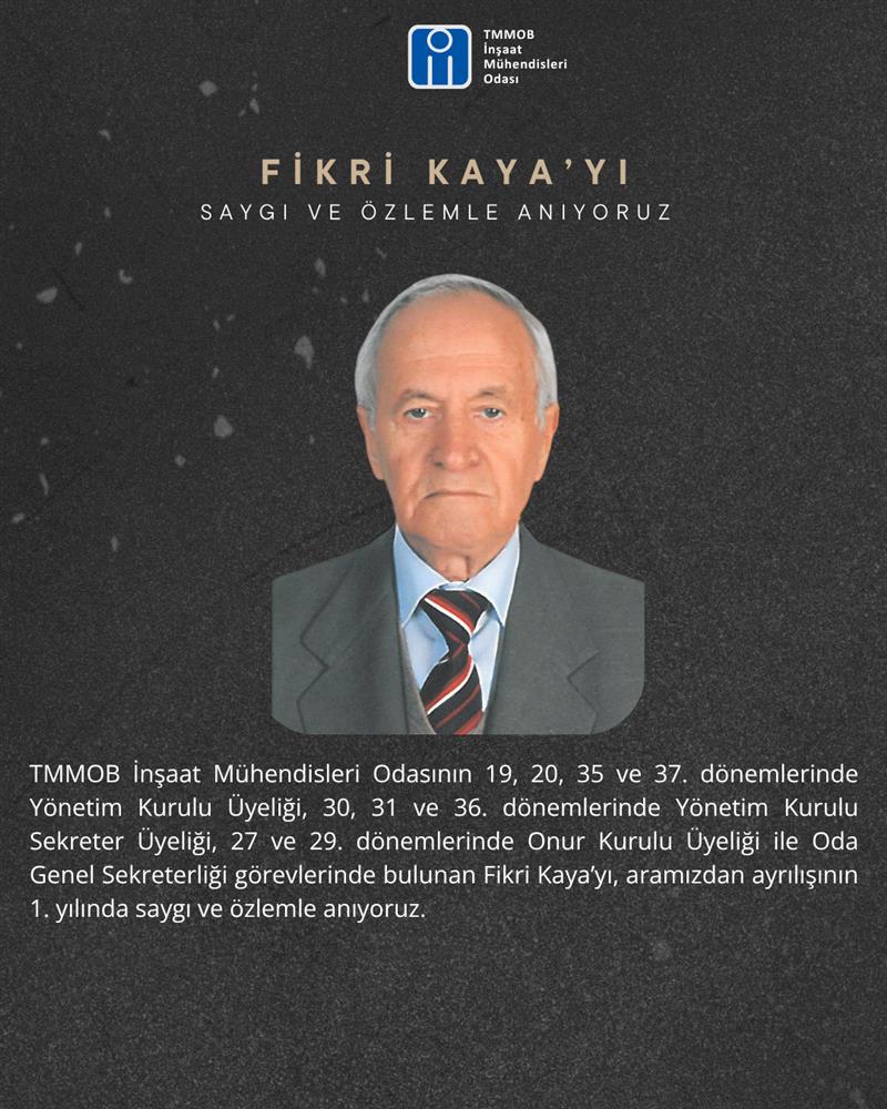 TMMOB İnşaat Mühendisleri Odasının 19, 20, 35 ve 37. dönemlerinde Yönetim Kurulu Üyeliği, 30, 31 ve 36. dönemlerinde Yönetim Kurulu Sekreter Üyeliği, 27 ve 29. dönemlerinde Onur Kurulu Üyeliği ile Oda Genel Sekreterliği görevlerinde bulunan Fikri Kaya’yı, aramızdan ayrılışının 1. yılında saygı ve özlemle anıyoruz.