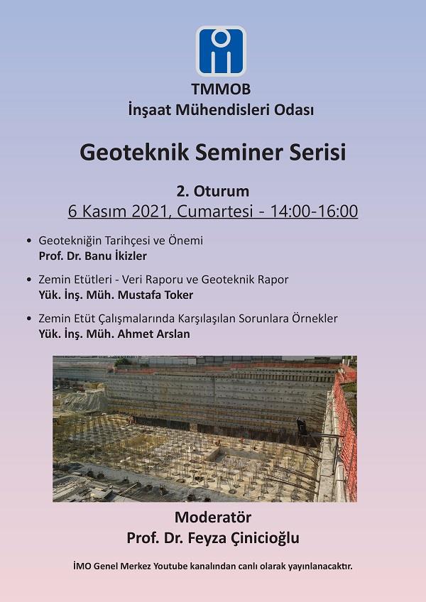 TMMOB İnşaat Mühendisleri Odası tarafından düzenlenen Geoteknik Seminer Serisinin ikincisi, 6 Kasım 2021 Cumartesi saat 14.00-16.00 saatleri arasında çevrimiçi olarak gerçekleştirilecek.